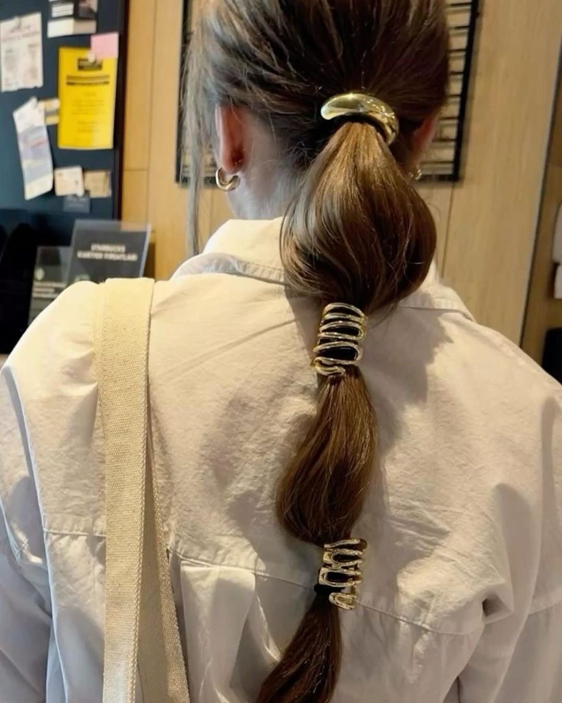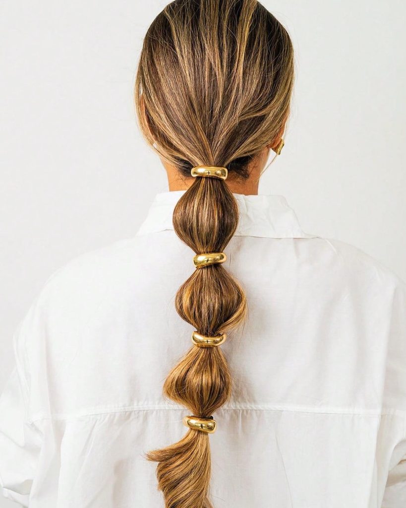 The bubble ponytail, which is decorated with the help of several golden bands, is a fun but strict hairstyle for girls with long hair. The chic style intermingles the indie charming with modern aesthetics, making it suitable for casual or semi-formal events. The golden bands serve as the expertly customized final touch while still making the wearers who are young, cool, and trendy.