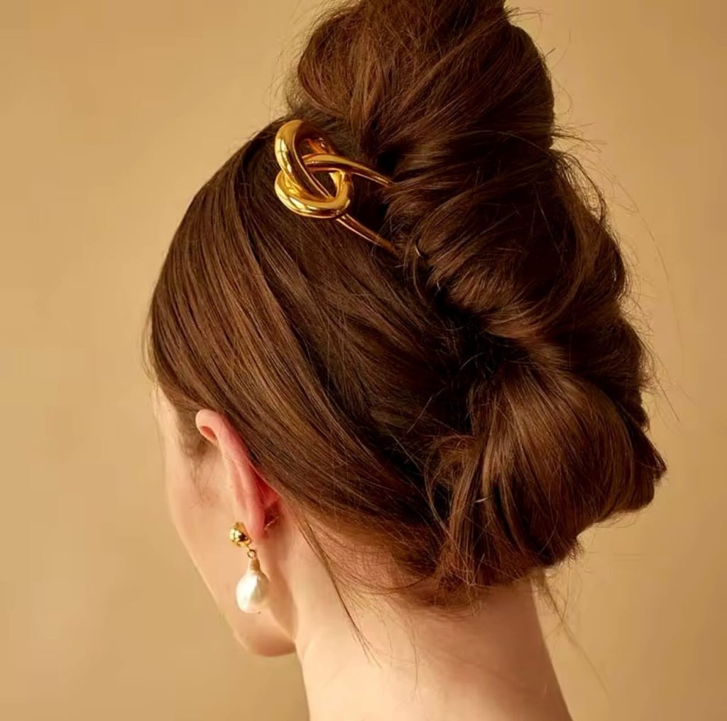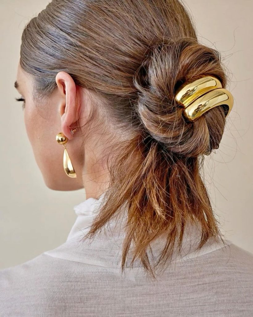 A simple elegance imitating the luxurious hairstyle with the help of a bold gold bar clip is a fashion stylist choice for an updo. It is a modern, elegant option for a medium-length or long hair that fits feminine evening parties as well as formal settings. The bun’s crisp lines with the metallic clip give a feeling of the contemporary 90’s the style that speaks of the pure beauty.