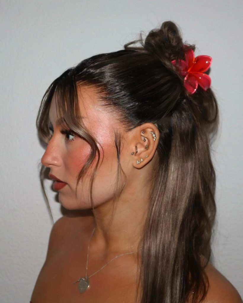 The cherry red flower-shaped clip will do its magic on this half-updo, and it will go from semi-disposable to vivacious, bold, and playful in an instant. This lovely hairstyle will be the best option for the girl with worn curls and bangs on the face and for her hair to be mid-length or long. The flower clip is a great way of adding a tropical boho touch to the hairstyle, which will suit it for a picnic, summer music festivals, or even for a date. You could add the flower to the hair and the makeup to the outfit, which would give it a very attractive and feminine aspect.