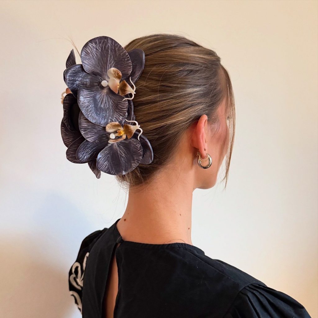 This beautiful low bun is adorned with an enormous orchid-inspired flower clip that makes a bold statement and a dramatic end to the bun. It is perfect for wearing medium-length or long hair as the style is ideal for events like formal occasions or weddings, a perfect blend of glam and sophistication. The big clip serves as the focal point, which is why this hairstyle becomes a fashion statement for celebrations.