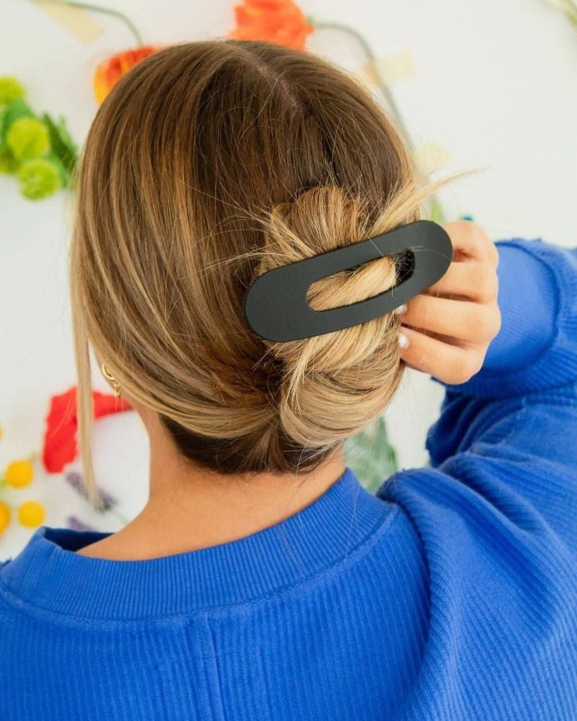A beautiful low bun is all about being elegant black oval clip that gives the hairdo a clean and minimalist look. This style is ideal for shoulder-length or shorter hair and can be worn in both business and semi-formal settings. A black clip is the perfect accessory with hair that is a light color, it introduces a small element of theater.