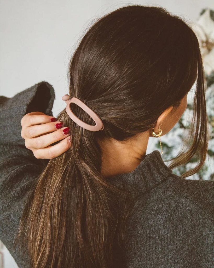 This low ponytail fixed with a matte pink clip is an ultra-modern addition of understated elegance. It is equally interesting for medium-length or long hair and is suitable for both casual and business environments. The soft pink shade of the clip beautifully matches warm, earthy outfits, thus bringing a girl’s touch to a plain style.