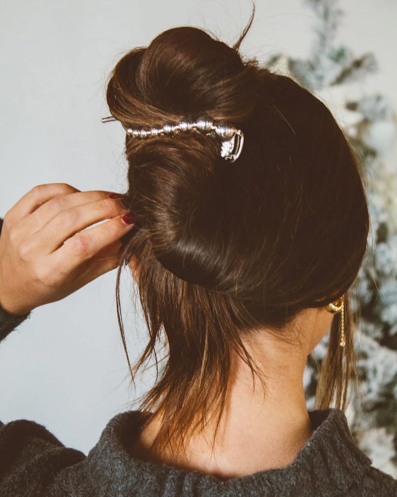 The French twist is a sturdy updo that is best suited for formal occasions and is a fashionable way of carrying it. This hairstyle is appropriate for medium to long-length hair and creates a very chic look. The metallic clip, which adds a touch of glam, will turn it into an ideal accessory for wear in the evening.