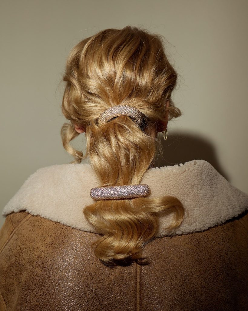 Gold clips are the only accessories you need to turn a layered ponytail into a hairstyle that would be both structured but fun. The metallic elements are what give it this tough, 90s punk attitude, thus, you can wear it both casually or for an evening out. The combination of the bare classic look and the add-on innovative design details makes the hairstyle appear modern to a classic ponytail.
