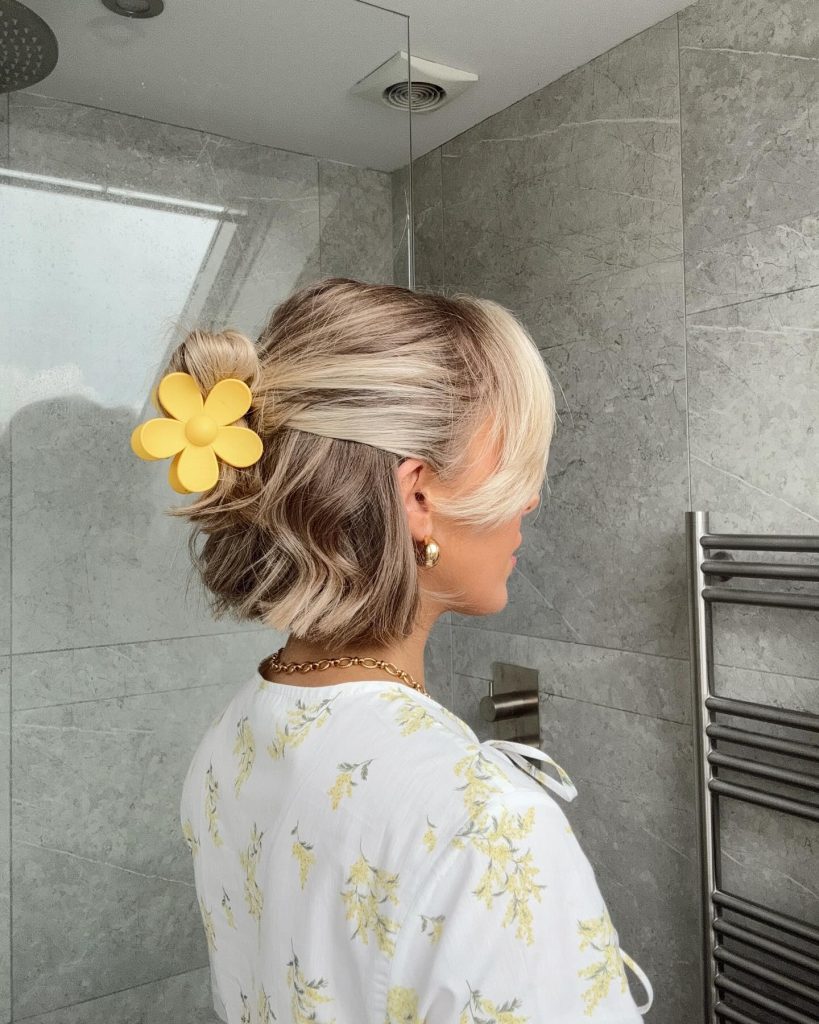The easygoing style consists of a joyful yellow flower hair clip over the loose wavy hair. Its suitability for short hair describes the playful character of the style. Young girls can wear it on their playful outings and during informative spring events. The big clip not only provides a contrasting element but also matches pretty well with the light floral outfits, resulting in a relaxed and bright appearance.