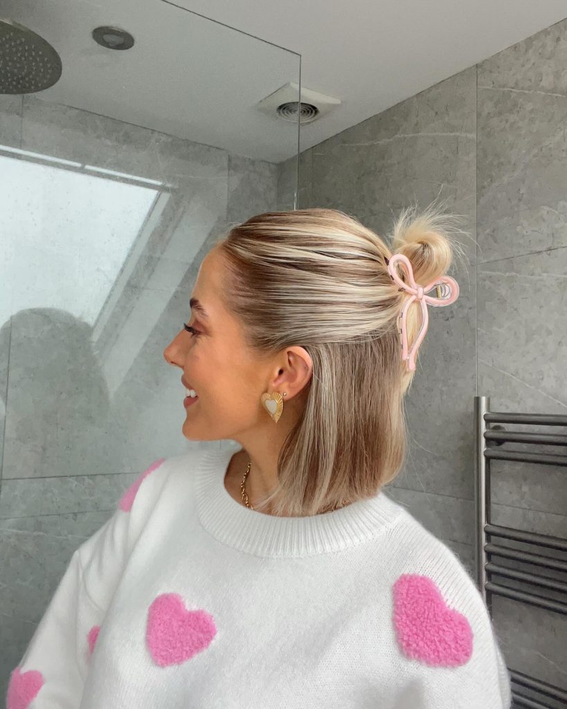 Wearing a bare pink bow clip, this stylish half-up is a mode that blends simplicity with the touch of an item. The perfect hairdo for short hair, it is an elegant finish that can be created for everyday wear and even loose working environments. It is the pastel pink bow that brings the look, that youthful and fun detail.