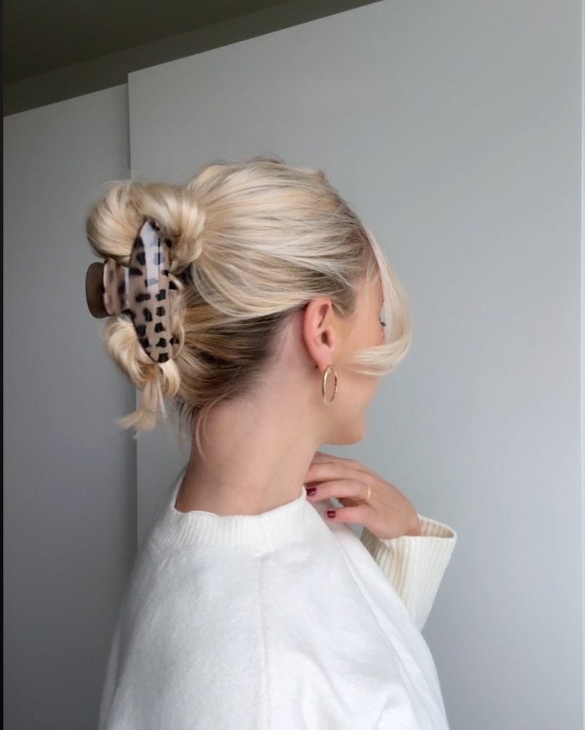 A twisted updo fixed with an audacious leopard print claw clip is a fun alternative to a classic hairdo. Ideal for short and medium hairstyles, this look gets the best combination of smoothness and the hottest wild accessory. It is an cool idea for casual lunches or when you want to lighten up your day with a stylish accessory.