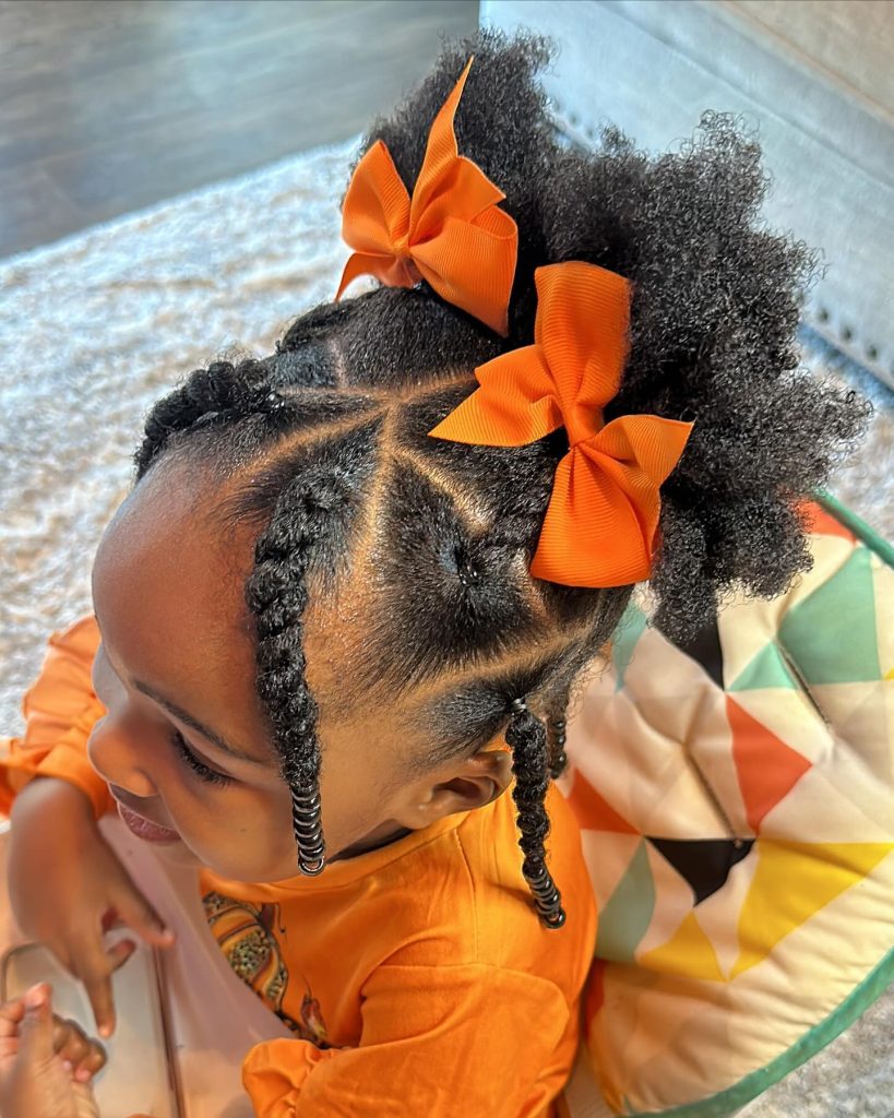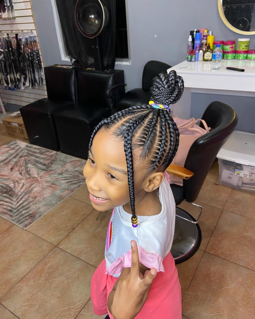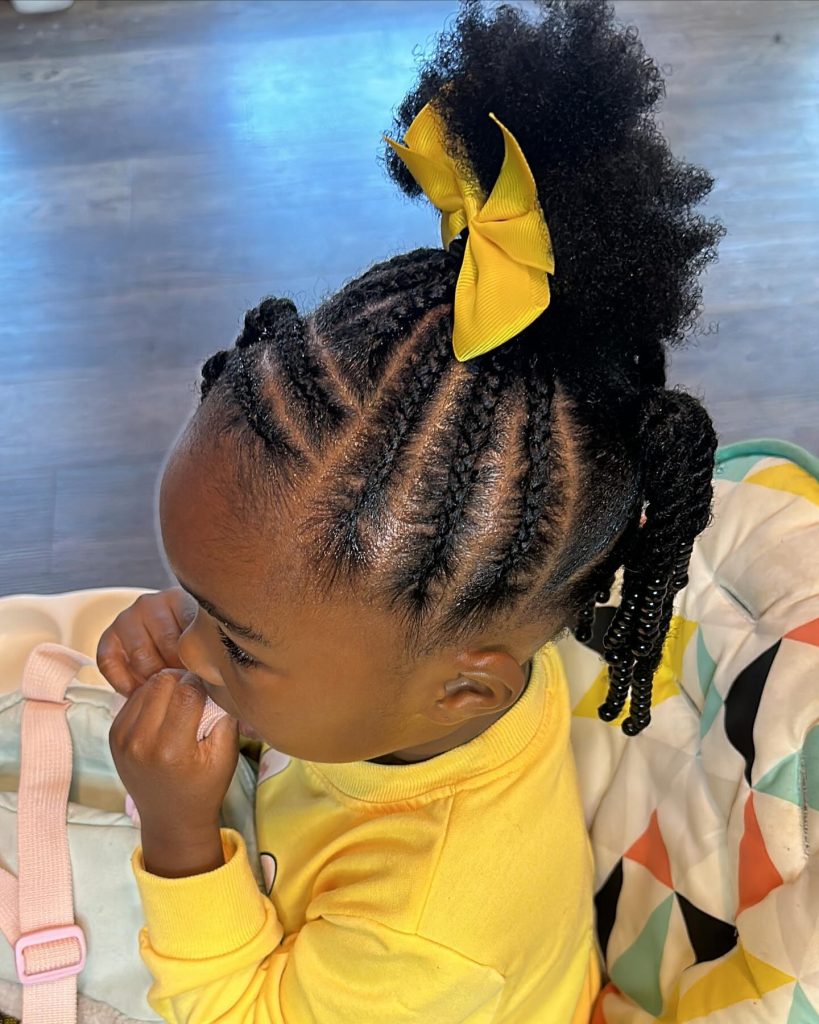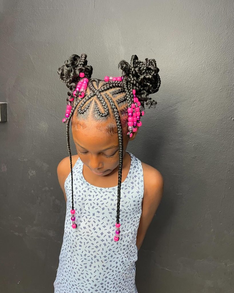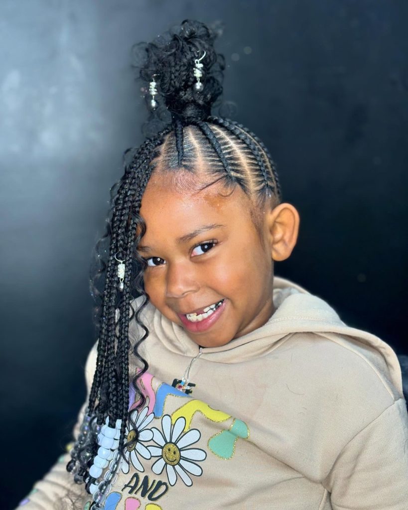 This charming style combines sleek cornrows with loose curls, decorated with silver beads for an added touch of elegance. The braids are gathered into a small top knot, offering versatility and a modern twist on traditional braided for children styles. The loose curls add volume, making this an eye-catching choice for black girls who love creative, cute looks for events or photo shoots.