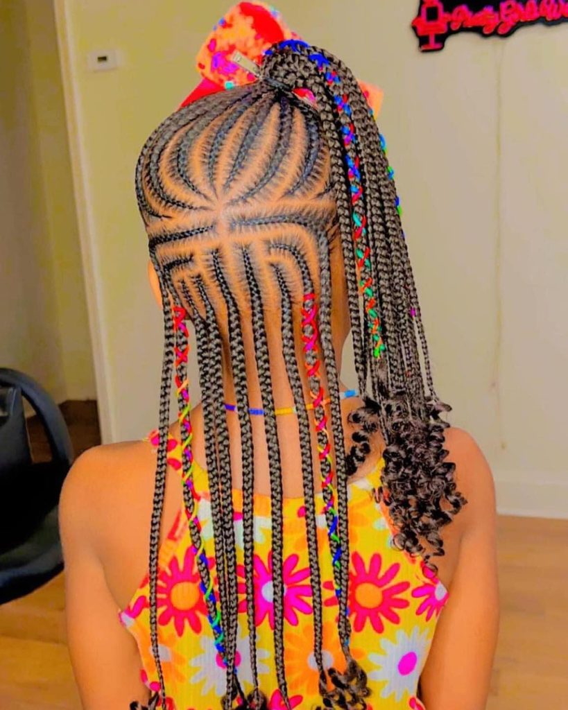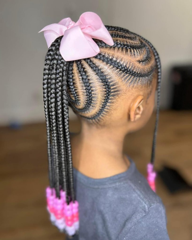 This style is a stunning example of creativity in cornrows, with intricate patterns leading to a low ponytail at the back. The ends of the braids are adorned with pink and white beads, adding a pop of color and movement. The pink bow enhances the feminine touch, making this a go-to hairstyle for black girls braids who love a polished and fashionable look. It’s also practical, as the style stays neat for extended periods, making it suitable to school or for festive events.