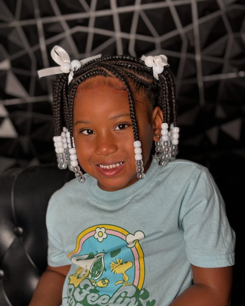 For a minimalist yet striking hairstyle, boxed cornrows styled with white beads are a classic choice. This look is practical for school age children and can be customized with accessories like ribbons or clips. The easy maintenance makes it perfect for parents who want a balance of beauty and function. This style also works well for black girls braids looking for a polished look without the need for weave or extensions. It’s versatile, transitioning seamlessly from casual school days to formal gatherings.