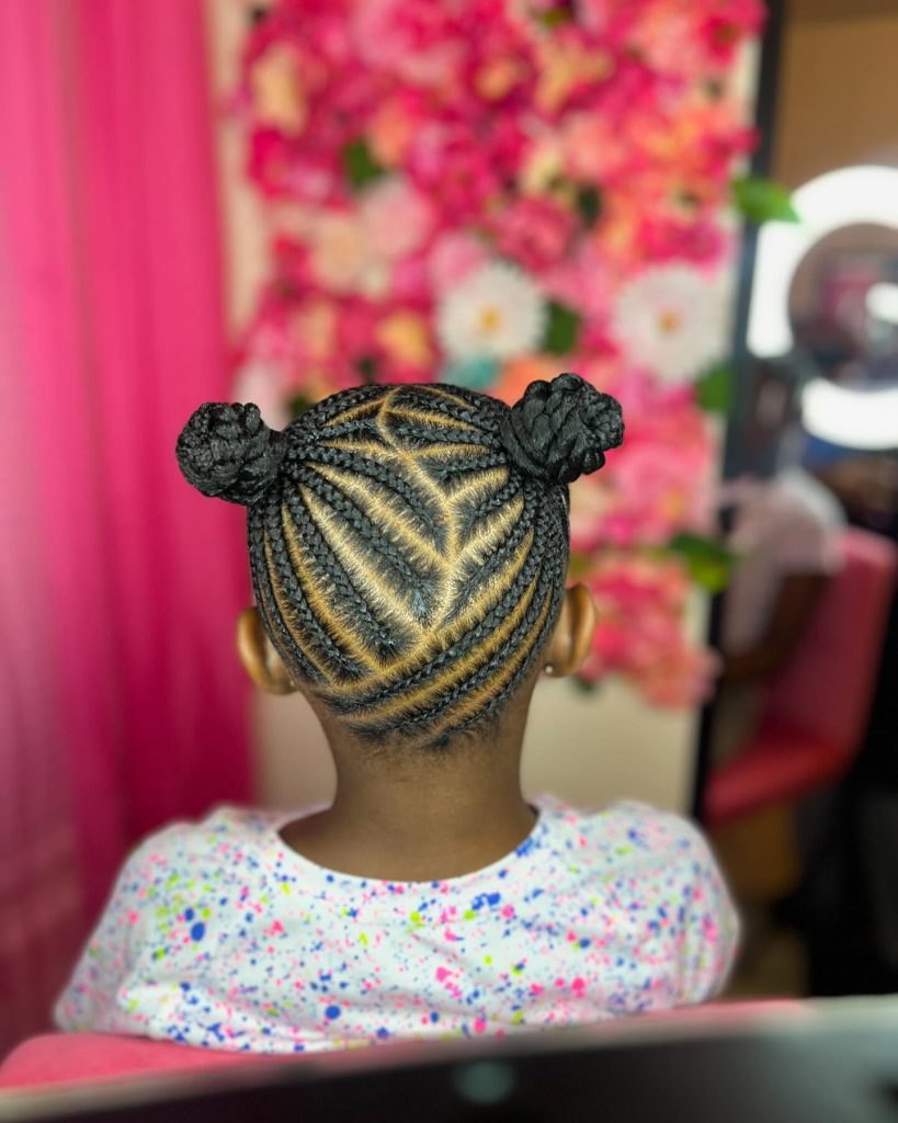 This intricate hairstyle features beautifully crafted cornrows shaped into a heart pattern at the back, leading to two adorable short buns. This look is a masterpiece for black girls braids, offering a mix of creativity and neatness. The double buns add a playful and youthful touch, making this style perfect for school age children who want something unique yet manageable. Ideal for festive occasions or to school, this design stands out while emphasizing the beauty of 4c natural hair.