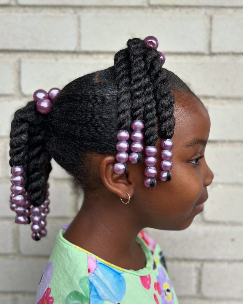 This chic hairstyle features a sleek ponytail of chunky twists adorned with vibrant purple beads. The twists are styled neatly, ensuring a polished and elegant look. Perfect for black girls braids who love an extra pop of color, this style offers versatility—it can be worn casually or dressed up for events. The absence of extensions or weave ensures a natural aesthetic while keeping the hair healthy. This style is easy to maintain, making it a great option for children.