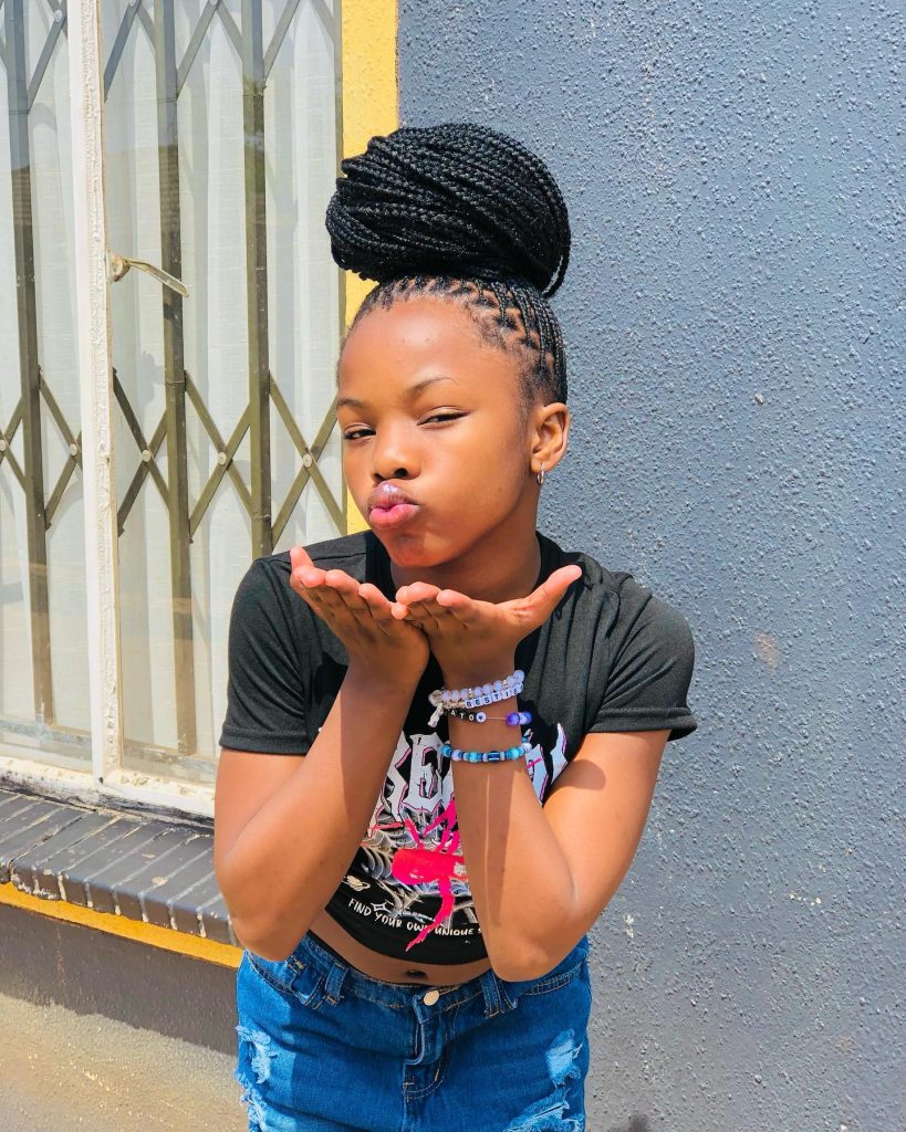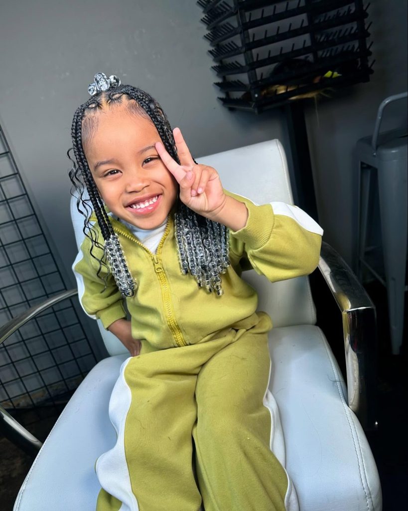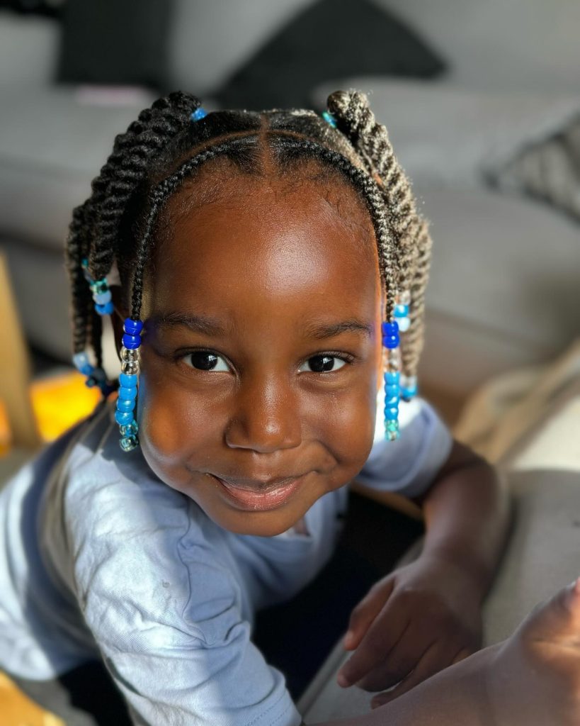 This playful and charming hairstyle highlights braided for children designs with a half-up, half-down look. The front braids are styled into two cute ponytails, while the ends are adorned with bright blue beads for added flair. This hairstyle is perfect for black girls braids and works well for everyday wear or fun outings. The school easy maintenance makes it a parent-approved favorite. It’s a perfect example of celebrating natural hair in a youthful and vibrant way.