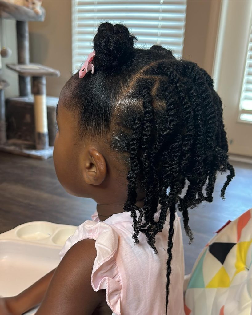 This creative style incorporates a mini bun at the crown with twisted ends cascading naturally. The sleek cornrow sections keep the look tidy and modern. The pink clip adds a charming detail, making this a versatile choice for children. This hairstyle celebrates natural hair textures without the need for weave and works well to school or for casual events. It’s an excellent option for black girls who enjoy styles that are both elegant and low-maintenance.