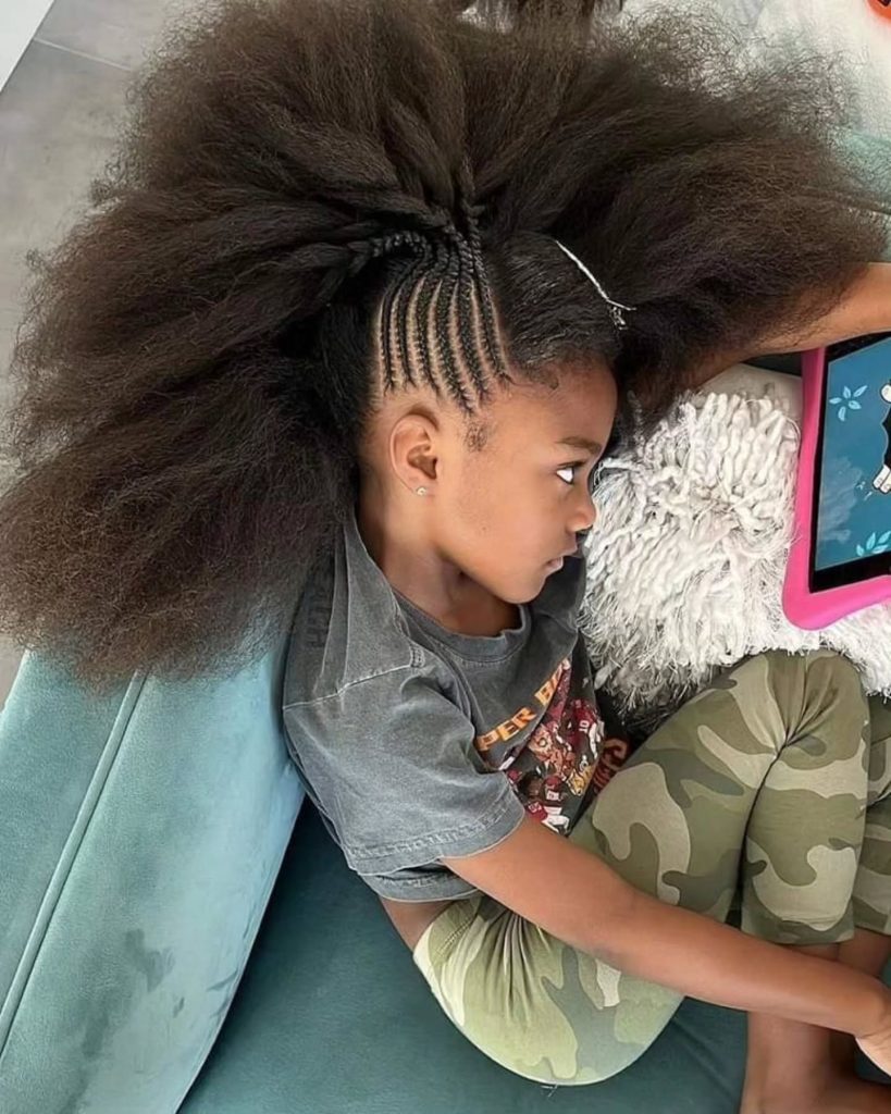 This bold and striking hairstyle combines side cornrows with a voluminous mohawk, showcasing the versatility of 4c natural hair. The mohawk’s texture creates a dramatic effect, perfect for kids who love making a statement with their style. The neat side braids keep the look tidy, ensuring it’s suitable for school easy mornings or creative photoshoots. This style is ideal for black girls who enjoy combining structure with flair.