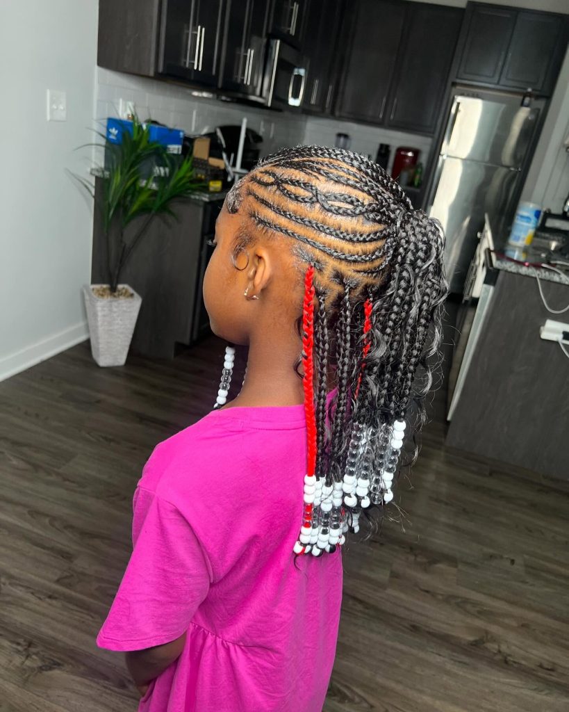 This vibrant look features a braided ponytail accented with red and white beads, offering a festive and stylish option for children. The intricate braid patterns add elegance, while the beads provide a playful, colorful element. This hairstyle is perfect to school or for family events, making it a versatile choice for black girls braids. The use of natural textures ensures that the hair remains healthy, with no need for extensions or weave.