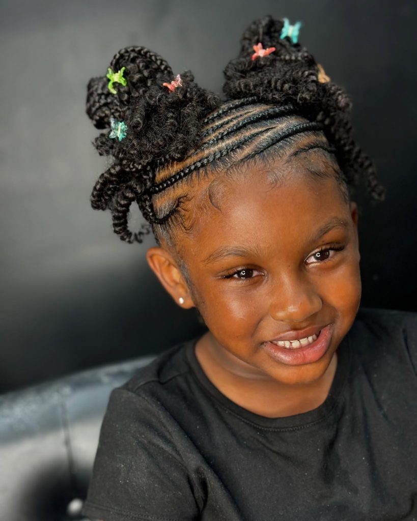This playful hairstyle features two textured buns adorned with colorful butterfly clips, creating a whimsical and fun vibe. The cornrows are neatly braided, leading to the buns for a structured yet lively look. Perfect for black girls, this style embraces 4c textures while offering a cute and low-maintenance option for children. Ideal for casual outings or parties, this look celebrates creativity and individuality.