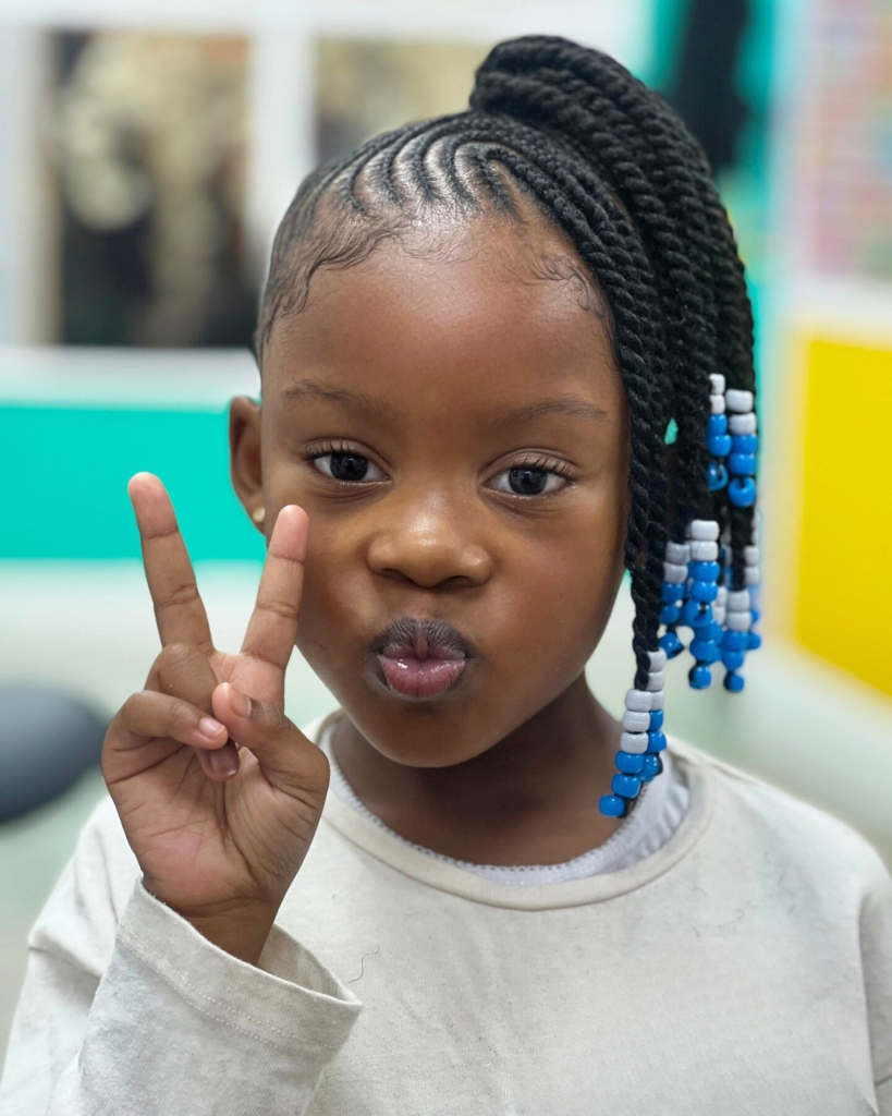 This high ponytail style features sleek cornrows leading into a side-swept ponytail adorned with blue and white beads. The bold color combination adds vibrancy, while the structured cornrows ensure a neat look. Perfect for school easy mornings, this style is both practical and fashionable. It’s a standout choice for children who enjoy colorful and dynamic hairstyles.