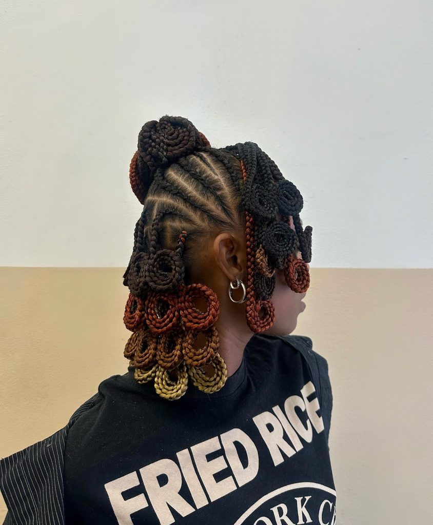 This artistic hairstyle features braided loops styled with a gradient of warm hues—brown, red, and gold. The structured cornrows lead into these bold, curled loops, giving the hairstyle a dynamic and eye-catching texture. Perfect for celebrations or special occasions, this look is ideal for black girls braids who want something stylish and unique. It highlights the creativity possible with natural hair, offering both volume and elegance.