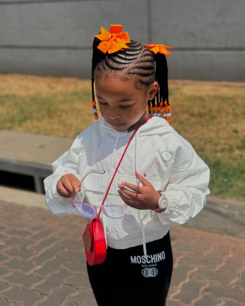 This symmetrical style features two braided ponytails accented with bright orange bows and orange-and-white beads. The cornrows are neatly patterned, emphasizing the structure and cleanliness of the look. It’s a fun and vibrant option for black girls braids, perfect for sunny outdoor activities, school days, or special events. The use of beads adds an extra playful element that children will love.