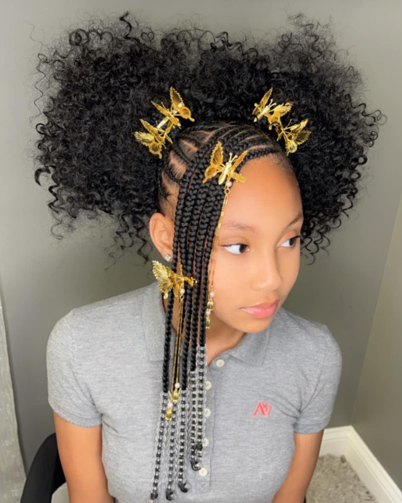 This ethereal hairstyle combines cornrows, braids, and voluminous curly puffs adorned with golden butterfly clips. The braids cascade down with beads for added charm, while the curly puffs frame the head, creating a regal and whimsical effect. Ideal for children who want a standout look, this hairstyle is perfect for weddings, parties, or photoshoots. It beautifully balances structure and softness.