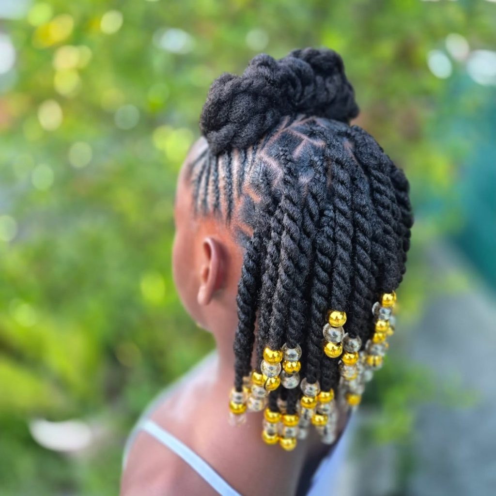 This elegant hairstyle features thick twists cascading from a braided crown and adorned with shimmering gold beads. The twisted sections offer a textured, voluminous appearance, while the gold accents add a touch of luxury. This style is perfect for formal occasions or as an everyday hairstyle for school age children. It celebrates natural hair while offering a polished, stylish look.