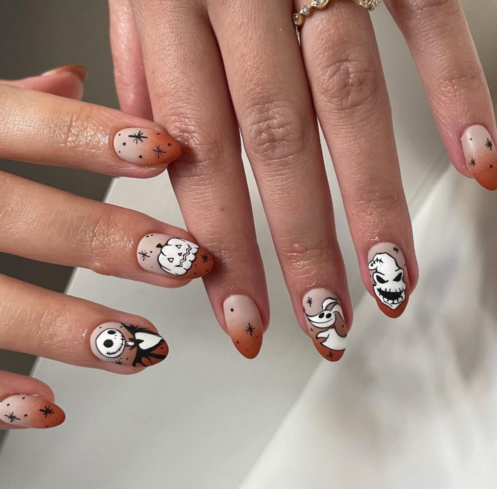 With the soft orange fade that looks like falling autumn leaves and the presence of characters such as Jack, Zero, and the pumpkin, among others, there is something so warm and adorable about this nightmare before christmas nails. The fun stars adequately placed on the nails are like a promise of cuteness added to the entire design making it light and yet scary.