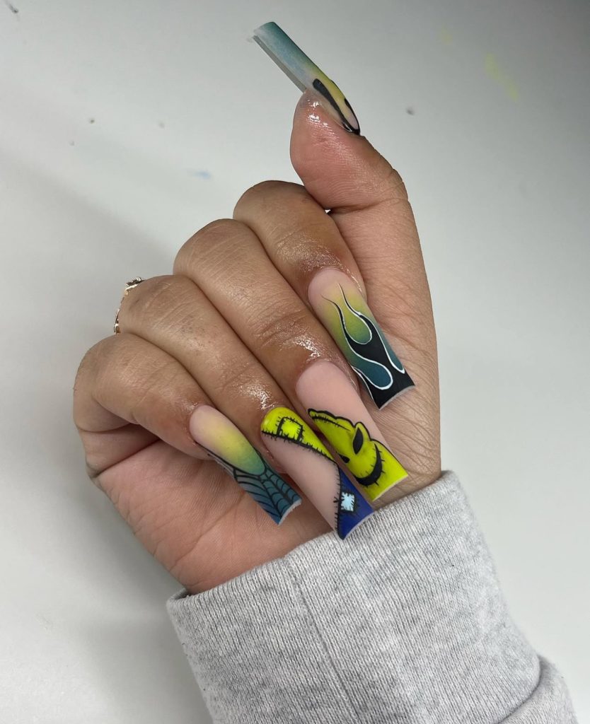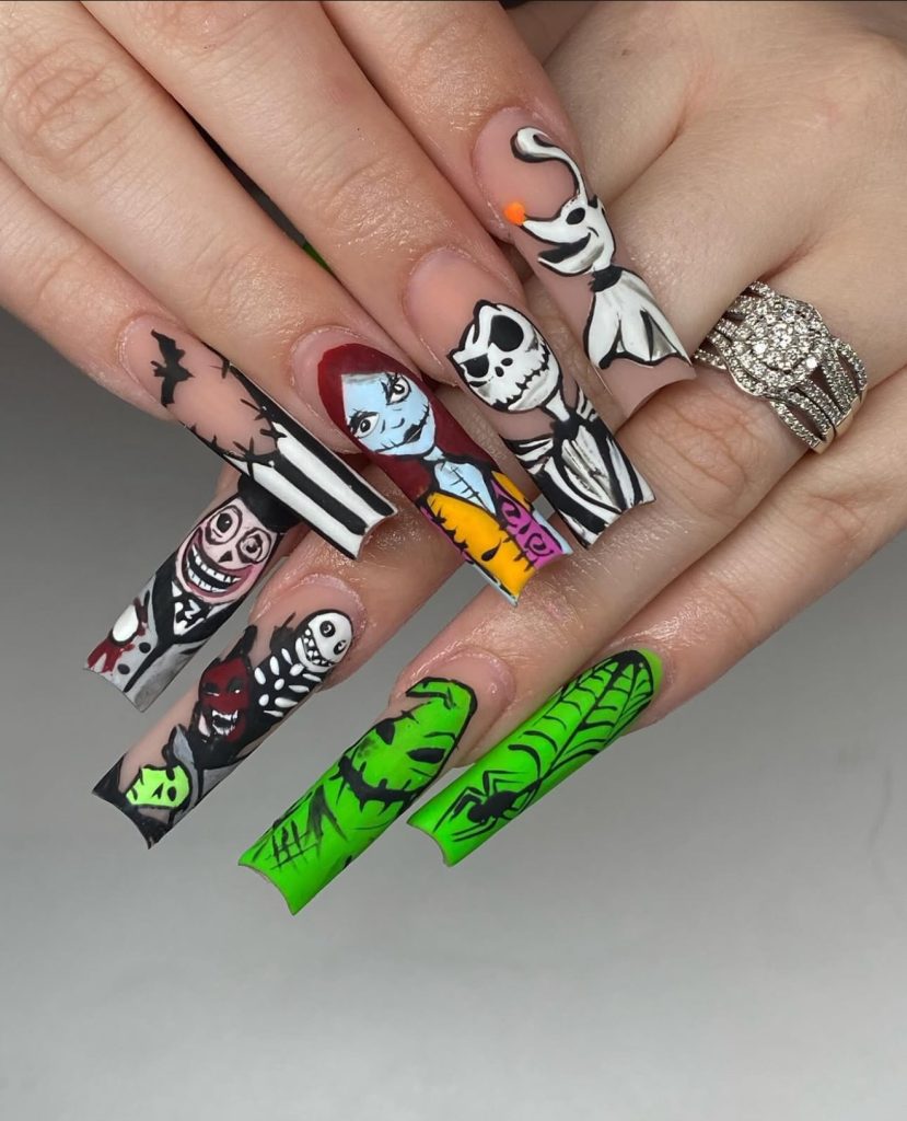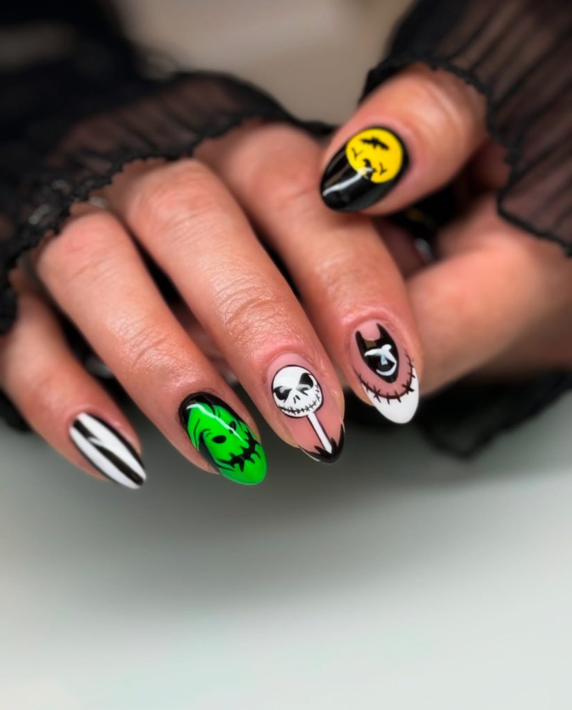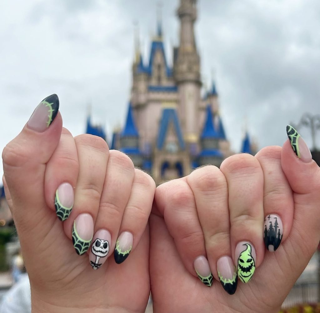 21. Neon Oogie Boogie Nightmare Before Christmas Nails