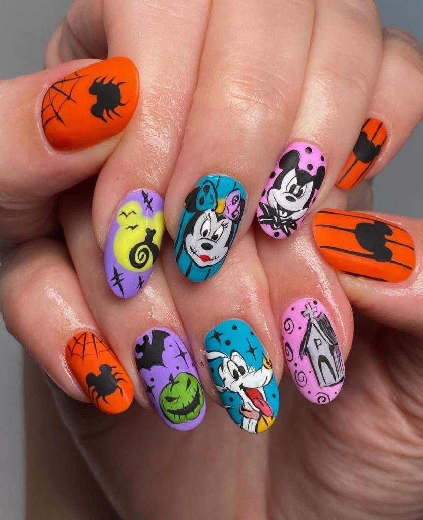 This slightly zany crossover design blends Disney magic and nightmare before christmas nail art so you get Minnie, Mickey, and even Pluto in a spooky Halloween transformation. The strong colors purple, orange, pink and blue trigger a certain festiveness and fun of this design.