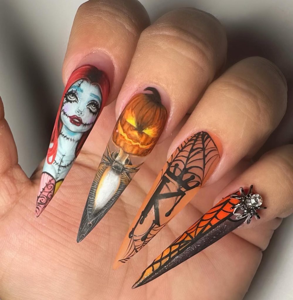These stiletto nails are gothic glam in their entirety, as fire-filled pumpkins and spider webs replete with detail adorn the portrait of the gorgeous and hauntingly beautiful Sally. It is dark, but glamorous in its design, featuring complex shades and a sombre colour scheme that screams Halloween chic.