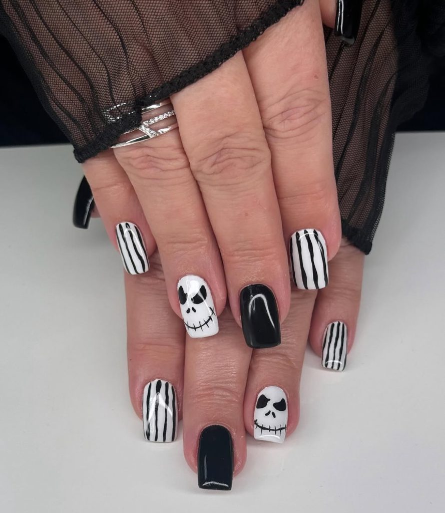 Bold black and white stripes with Jacks signature skeletal grin are nothing short of a nightmare before christmas nails. The white/black contrast makes it both classic and dramatic making it a great design to suit the person who prefers her minimal but dramatic manicure.