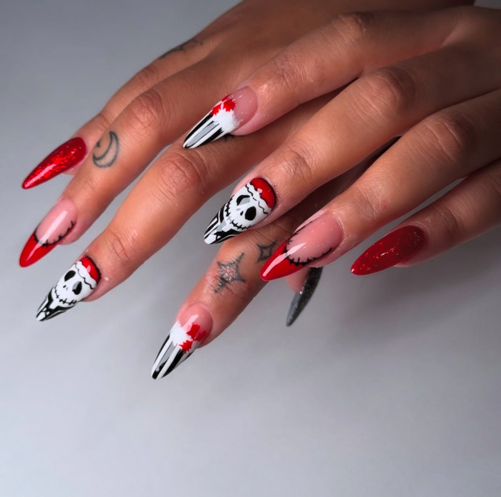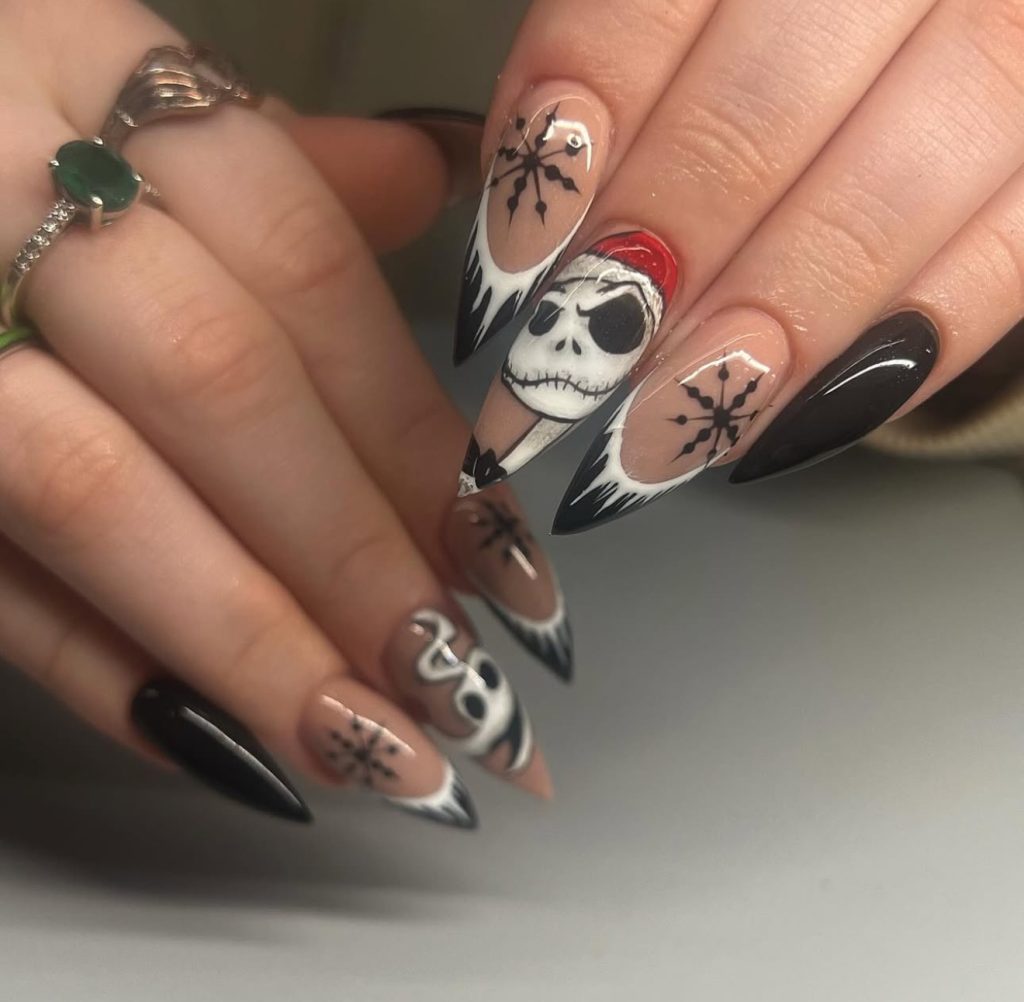 Santa Jack is shown in his other festive way with bright black tips and a snowflake. The chilly undertones make it winter-appropriate and suitable to anyone desiring a cross between Halloween and Christmas. The look is dramatic yet playful.
