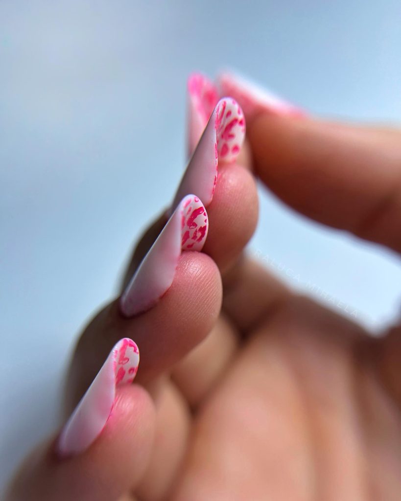 If you want a more stylish and adorable option, it is a pink gradient design that highlights the soft transition from a natural base to a bright pink tip. The slight, artistic patterns on the nails are what make them look splendid, and they form the second detail on these nails. These nails are nice for the season as they are fashionable and easy to pair with any other outfit.