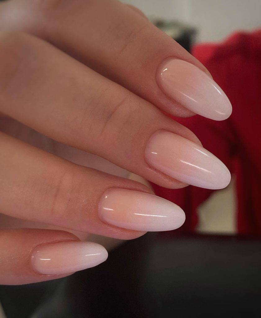 The nude-colored nails have been in trend for a long time, and this natural style is of course no exception. The glossy looking texture adds to the medium-length oval-shaped nails the charm of being very simple yet very sophisticated. These nails are the ideal choice for both business and leisure attire; they are multifunctional and everlasting in style.