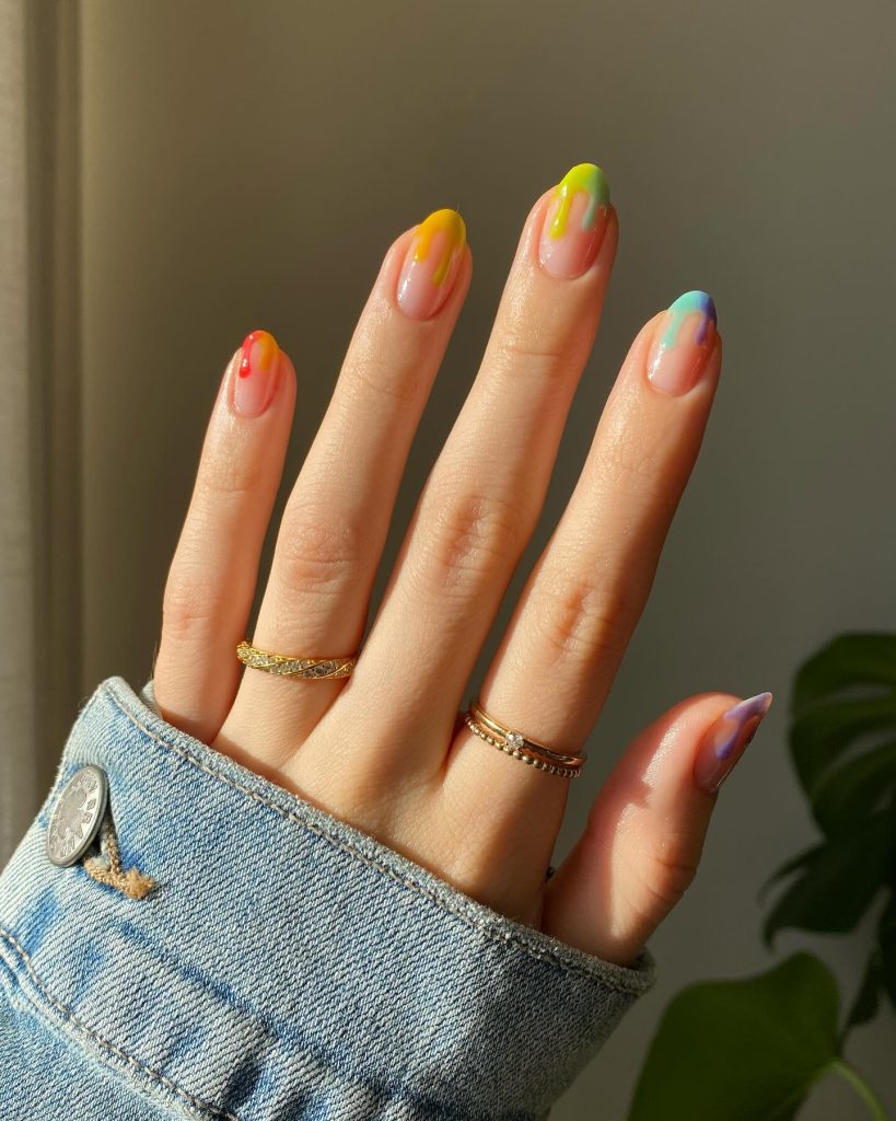 These rainbow drip nails are sporting the funkiest design ever. They are like the drip paint drops falling down from their origin to the bottom. The summer of this design is symbolic to the sounds of the ice cream man, colorful and uplifting. This style is a favorite for summer and will be a splash of color to each and every outfit.