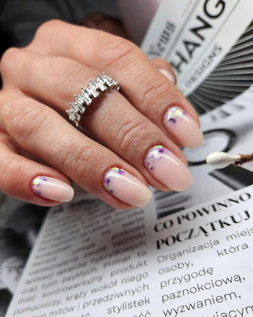 A trendy and cute design is the combination of glitter accents and delicate floral touches. The glitter near the cuticles adds a bit of sparkle, while the flowers detail brings a fresh and feminine touch. This design is perfect for the spring and summer seasons, and it is both elegant and fun.