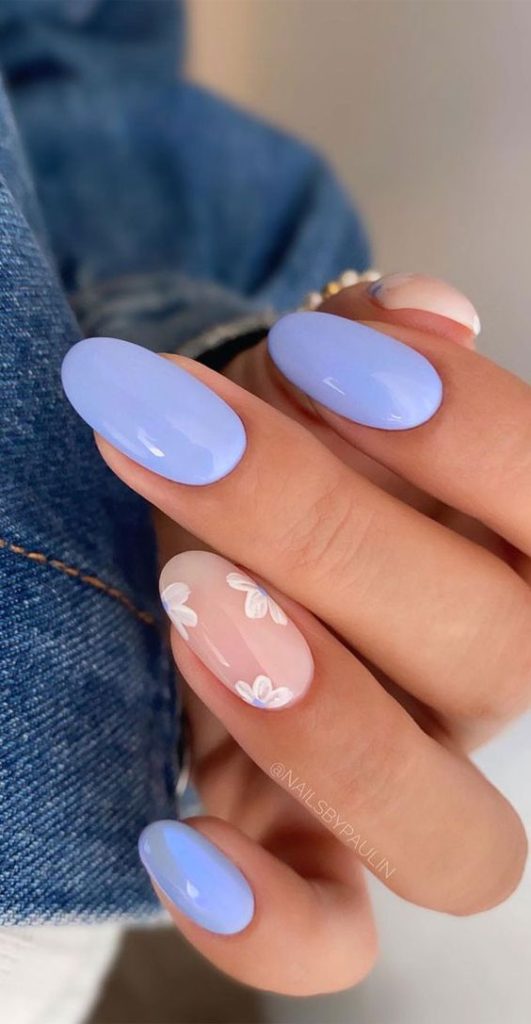This design features blue pastels, which are the main colors, and on a couple of nails, it is complemented with a subtle floral pattern. For those who want to add a fun and youthful twist to their appearance, this is a stylish choice. The blue nails are shiny and smooth, but the flowers add a gentle and elegant feeling. The design is mostly for spring or summer since it expresses the happy mood of the warm seasons.