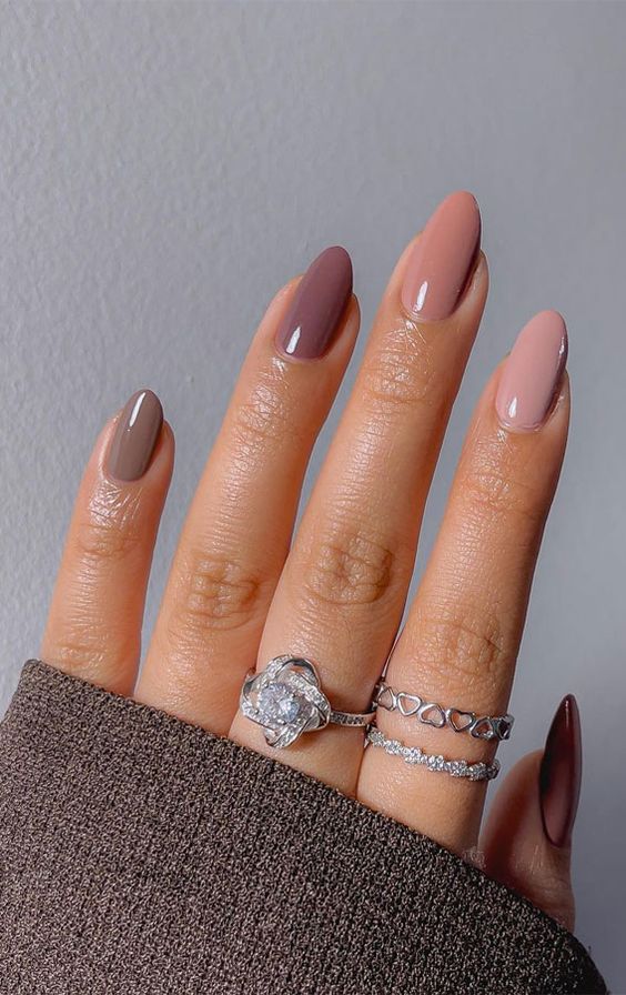 This combination of neutral tones in brown, taupe, and soft mauve is a trendy yet subtle option for those who favor the minimalist look. The fall colors are very bright, but they are also very simple and refined, which makes them suitable for both work and casual settings. The narrow oval form increases the class of these understated colors, which allows your hands to appear effortlessly graceful.