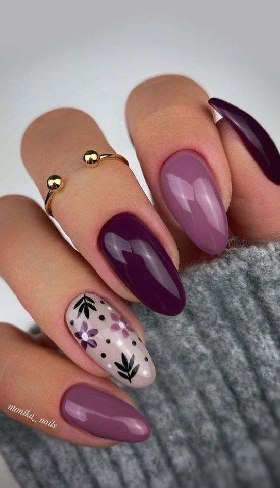 These nails are the first choice if you want to make a statement. They are purple with floral accents and are great for a night out or a special occasion. The dark purple lacquer, which looks marvelous against the intricate flower design, makes it more artful. The length and the oval shape make the nails more feminine and glamorous, which is the reason why they are perfect for winter or autumn events.