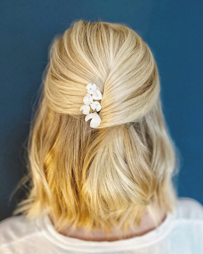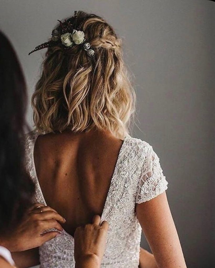 The half-up style is thoroughly feminine and stylish as the back of the hair is semi-lifted and held with a beautiful floral hair piece as the detailing. The blonde bob with obviously slight wind created on the hair surface shows the natural but it looks very well-polished. If you are planning to get married in a gorgeous but simple way, this hairdo is your perfect choice for beach weddings, bohemian-style ceremonies, or farmhouse settings. The floral pin is very soft and adds a touch of romance without making the hairstyle too complex.
