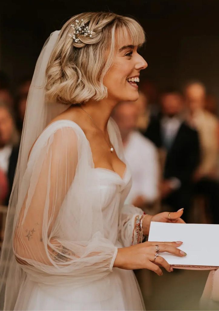 For a bride who prefers a modern yet romantic look, this wavy bob with bangs exudes effortless charm. The softly curled ends give volume and movement, while the front view is highlighted by delicate hair accessories tucked at the sides. The inclusion of a veil adds a classic bridal touch, effortlessly blending tradition with contemporary style. This hairstyle complements blonde or straight hair beautifully, creating a chic yet timeless aesthetic. It’s a perfect option for minimalist or bohemian weddings, where understated elegance is key.
