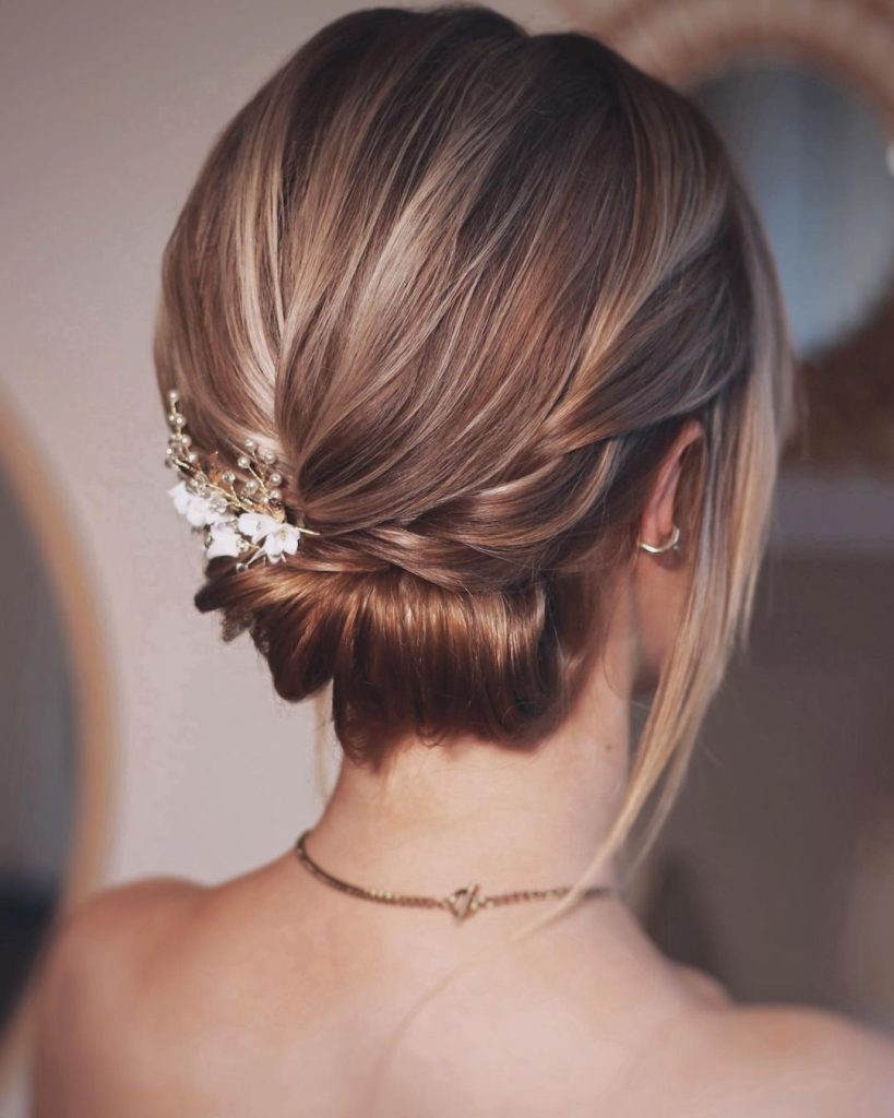 This bridal hairstyle is a chic interpretation of the traditional chignon, perfect for the brides wishing to have a sophisticated and neat updo. The hair is exclusively pulled back, with a gentle twist at the neckline, forming an elegant and ageless look. Pretty flower ornaments of pure white and golden charms lend a charming touch of the past. This design would suit either fair or dark hair and it would greatly combine with a veil or tiara for a wedding atmosphere that is classic.