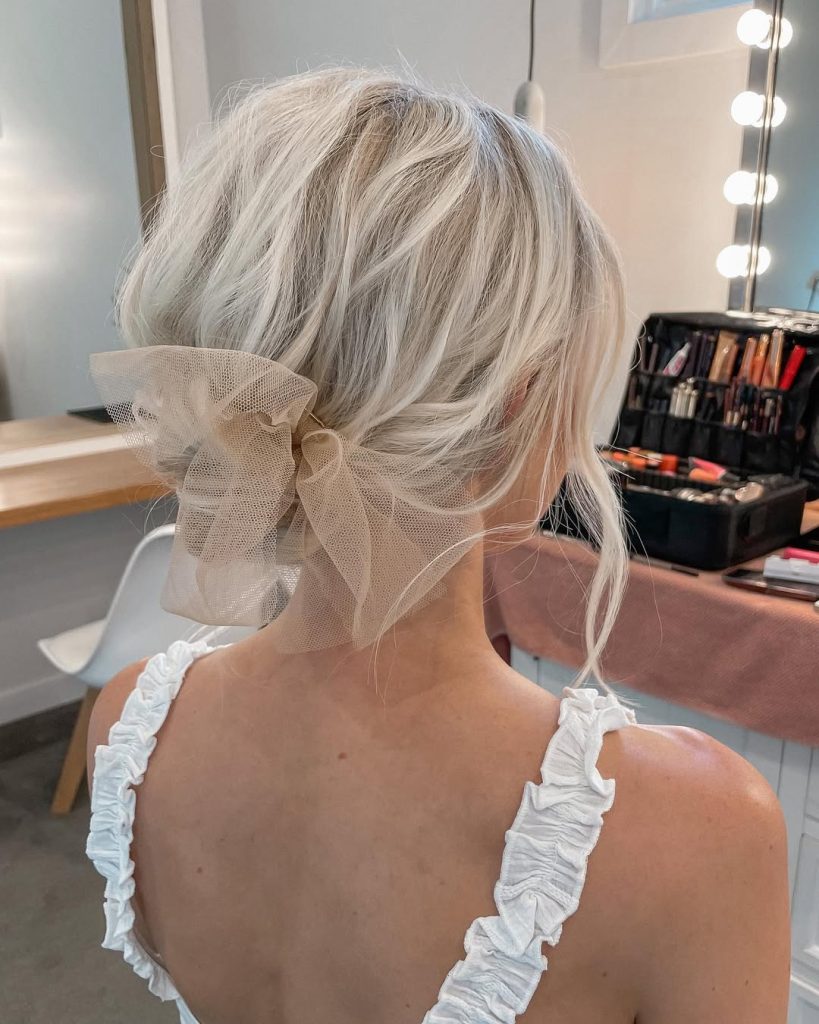 9. Messy Low Bun with a Tulle Bow Accent