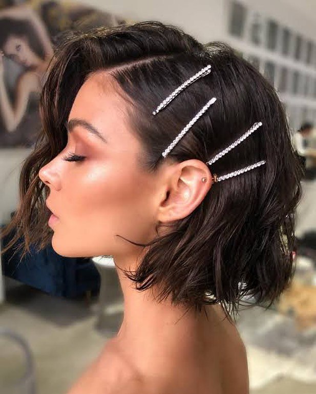 11. Sleek Wavy Bob with Crystal Hair Clips