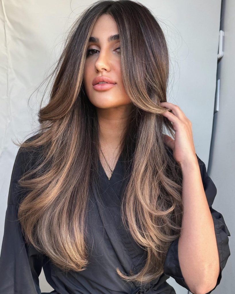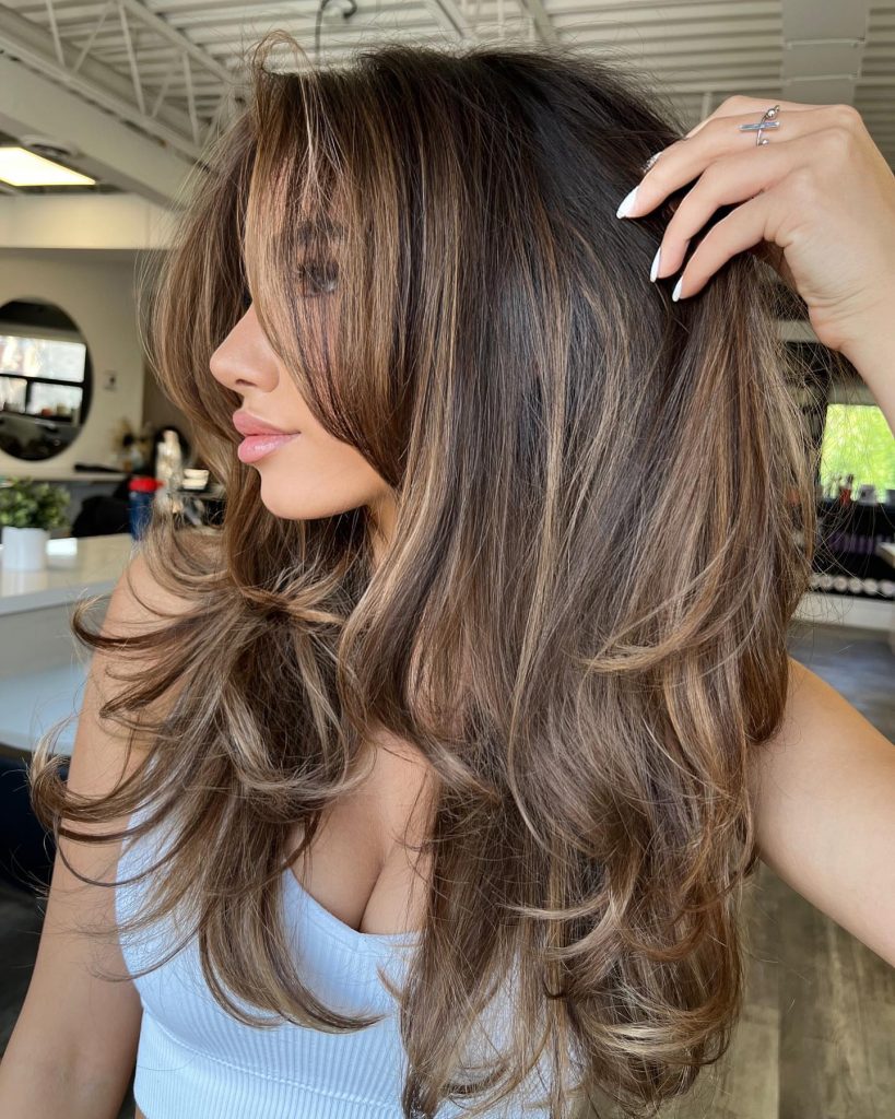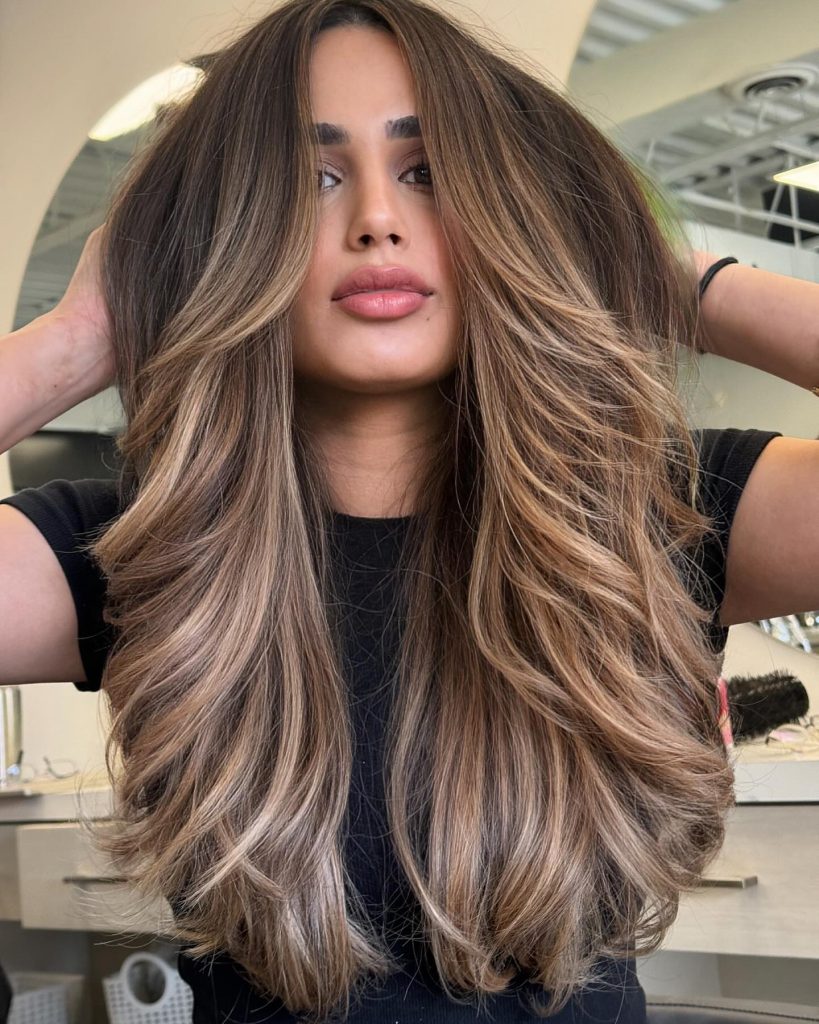 This layered haircut is a wonderful style that is complemented by caramel highlights that border the face, thus, making the features brighter and adding overall to the styling. The light highlights are rooted and the colors go interspersed so that they create an easy soft transition to the longer hair that is the model hairstyle. The layers bring about the mobility and the permeability; therefore, this hairdo not only is very fashionable but also is quite easy to care for. It is a very good decision for people who want to give some depth and thickness to their hair while they leave it in its natural color.