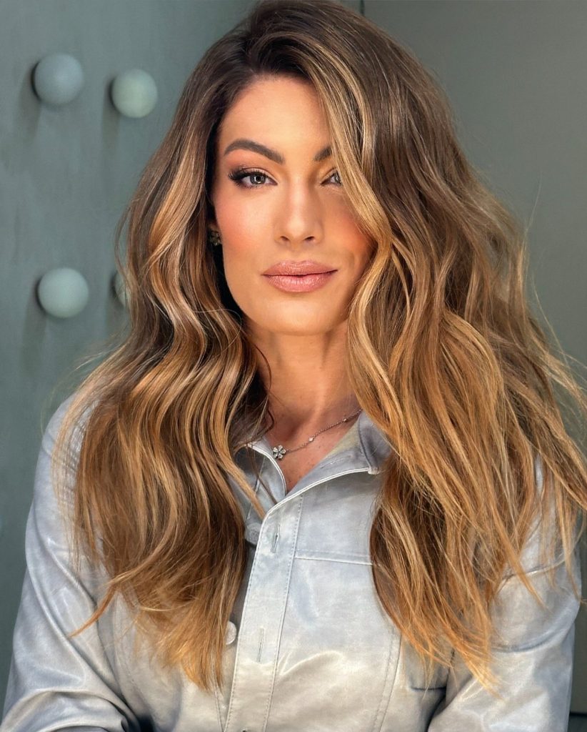 The hairstyle that is quite long is adorned with thick layers and light caramel highlights that showcase the face. The visual element of the hairstyle is created by the initiation of the highlights near the roots, their gradual blend with the lengths, and the effect of the natural sun-golden light on the hair. The cut in layers provides a dynamic look that is brisk and full, while the caramel color does not just lighten the hair but also deepens and outlines it all at once.