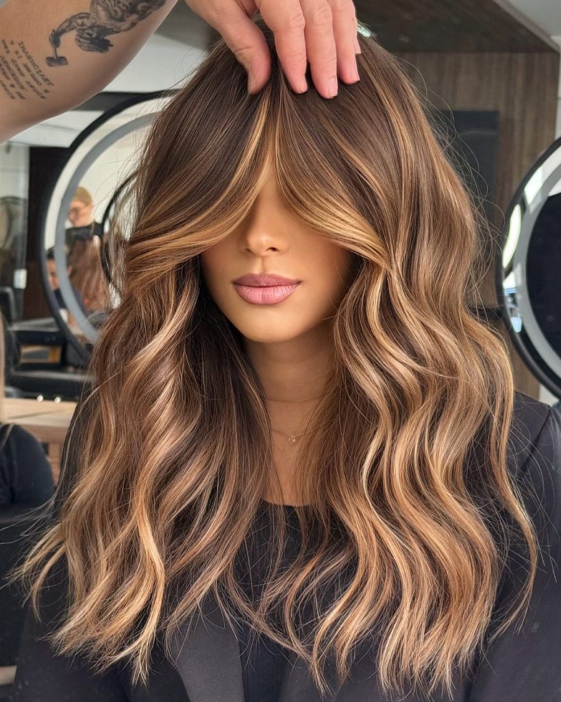 This looks like a beautiful hairstyle that includes the soft curtain bangs. They go in such a way that they become part of the hair’s wavy layers which are also framed by mother nature’s very own caramel highlights. The light caramel hues add a lively touch to the face and help the hairstyle attain moderate richness. It is a trendy hairstyle choice that can be updated with bangs and highlights for anyone who wants to look modern and attractive.