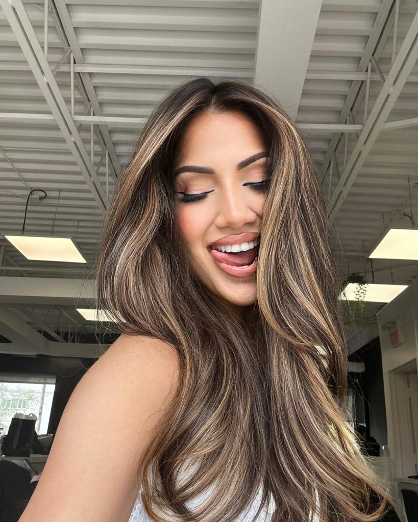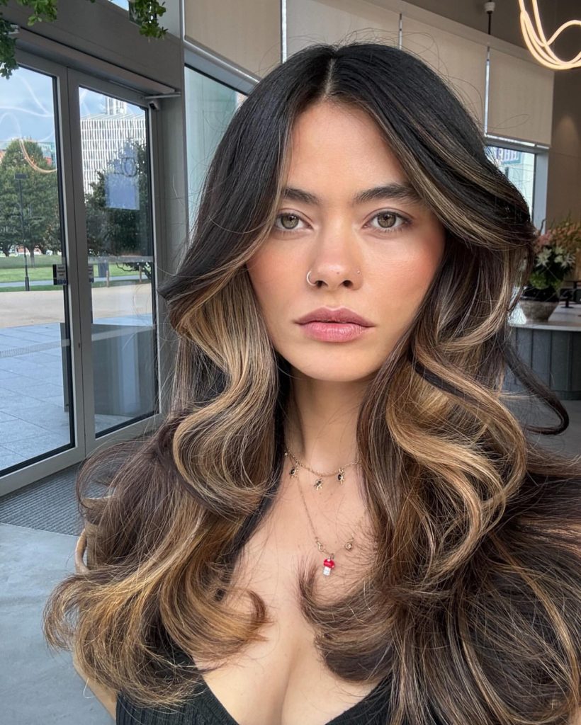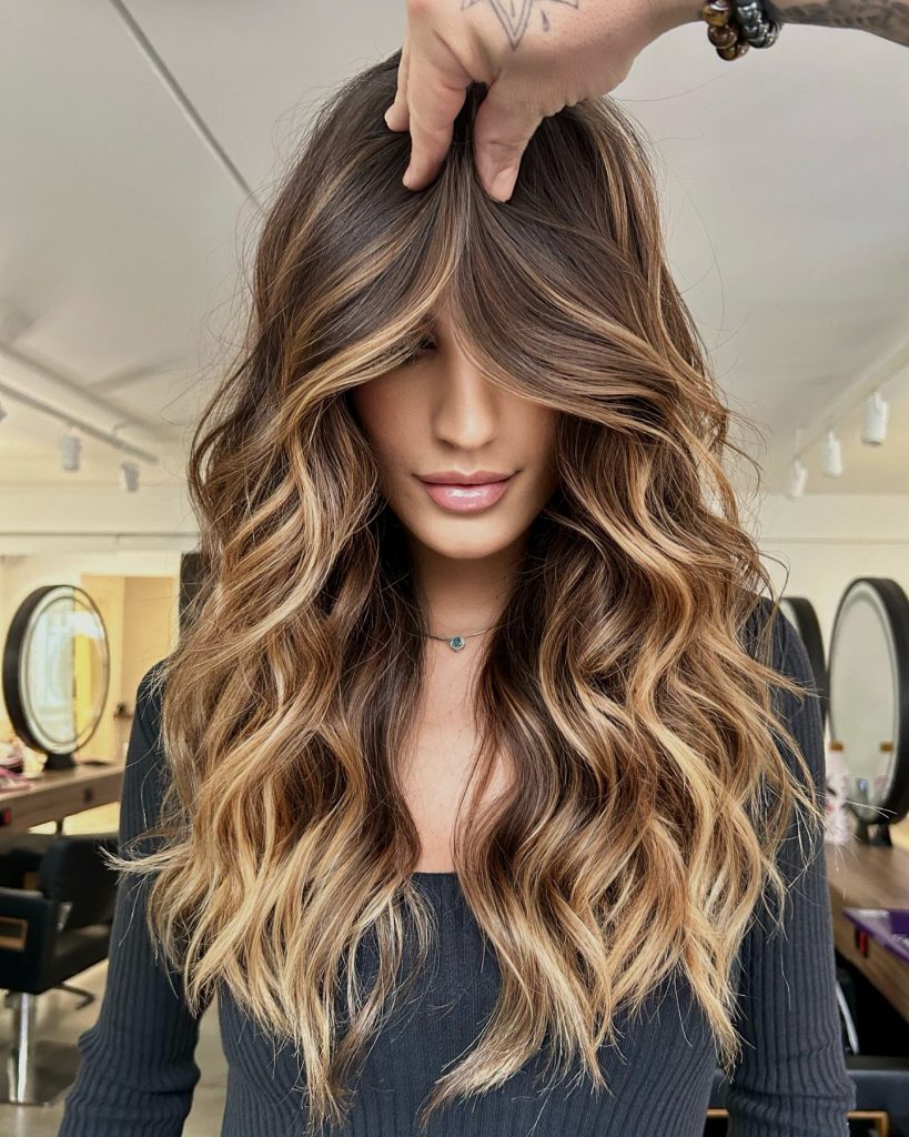 The volume and dimension of this hairstyle are the key to its appeal. The long hair is styled in big, bouncy waves, with bold caramel highlights adding contrast to the dark base. The highlights are concentrated around the front and through the layers, creating a sun-kissed effect that brightens the entire look. The layers provide movement while the voluminous waves give this style a modern, high-impact finish, perfect for those who love making a statement with their hair.