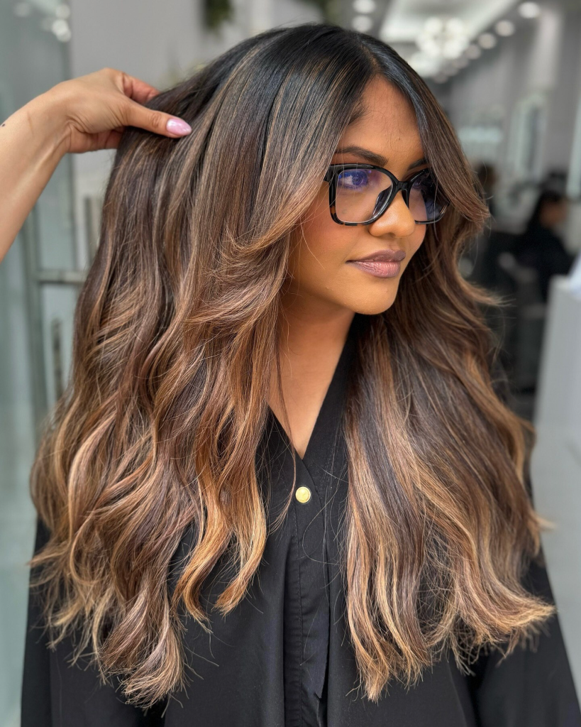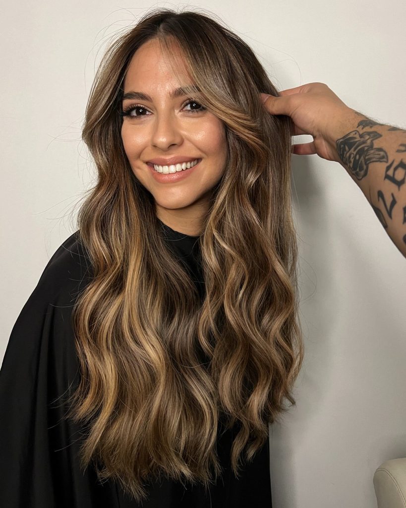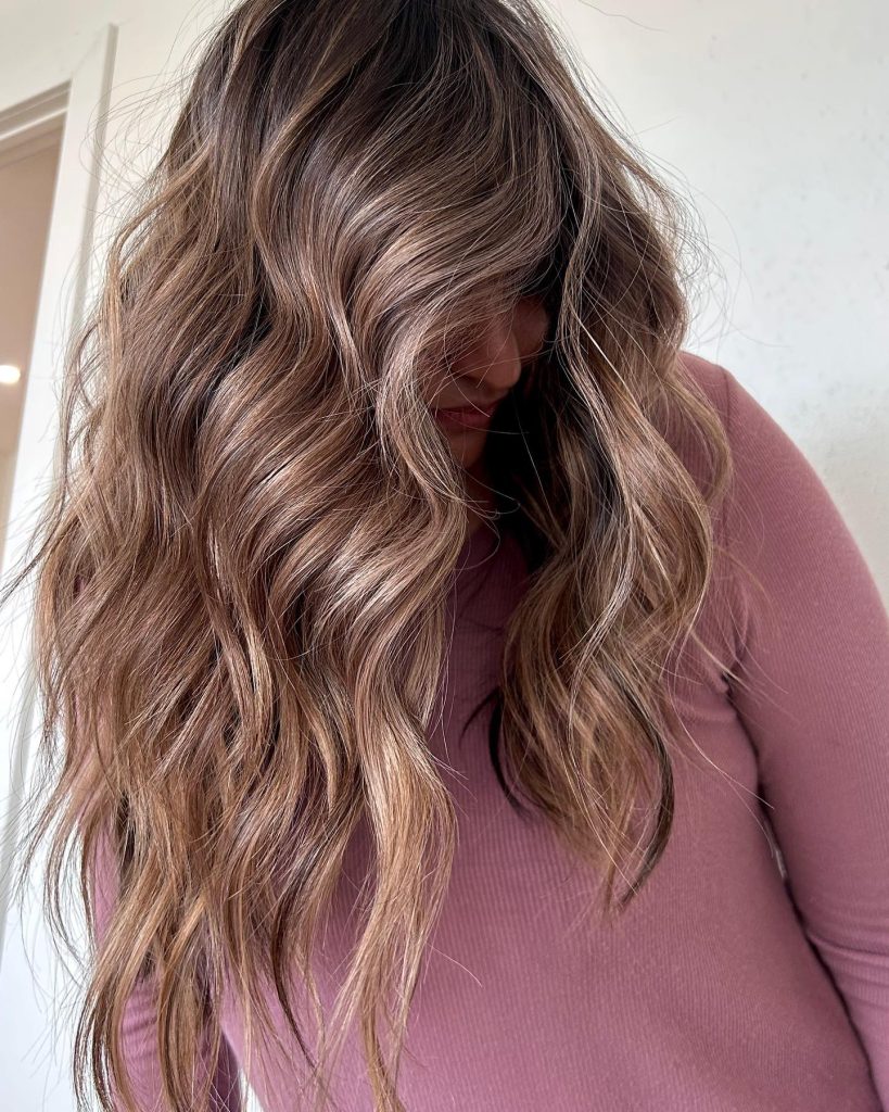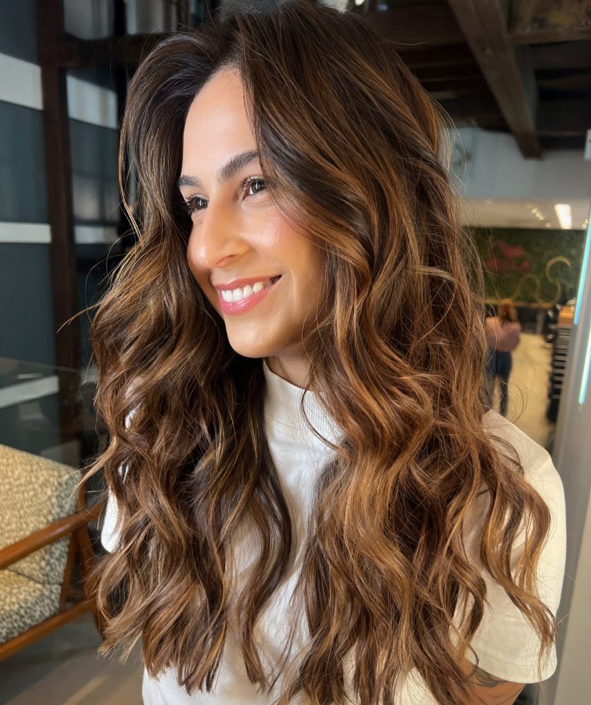 Here, the base color of rich brown is enriched with fine details of honey tones woven through the texture of wavy hair. The highlights are perfectly integrated into the hair making it look like a sun-kissed effect, all of that is achieved without hiding the natural hair color. Waves styled in a relaxed and free way highlighting the romantic and effortless aspect of the look. This hairstyle is ideal for people who want a nicer-looking, lower-key color correction with a bit of warmth just.