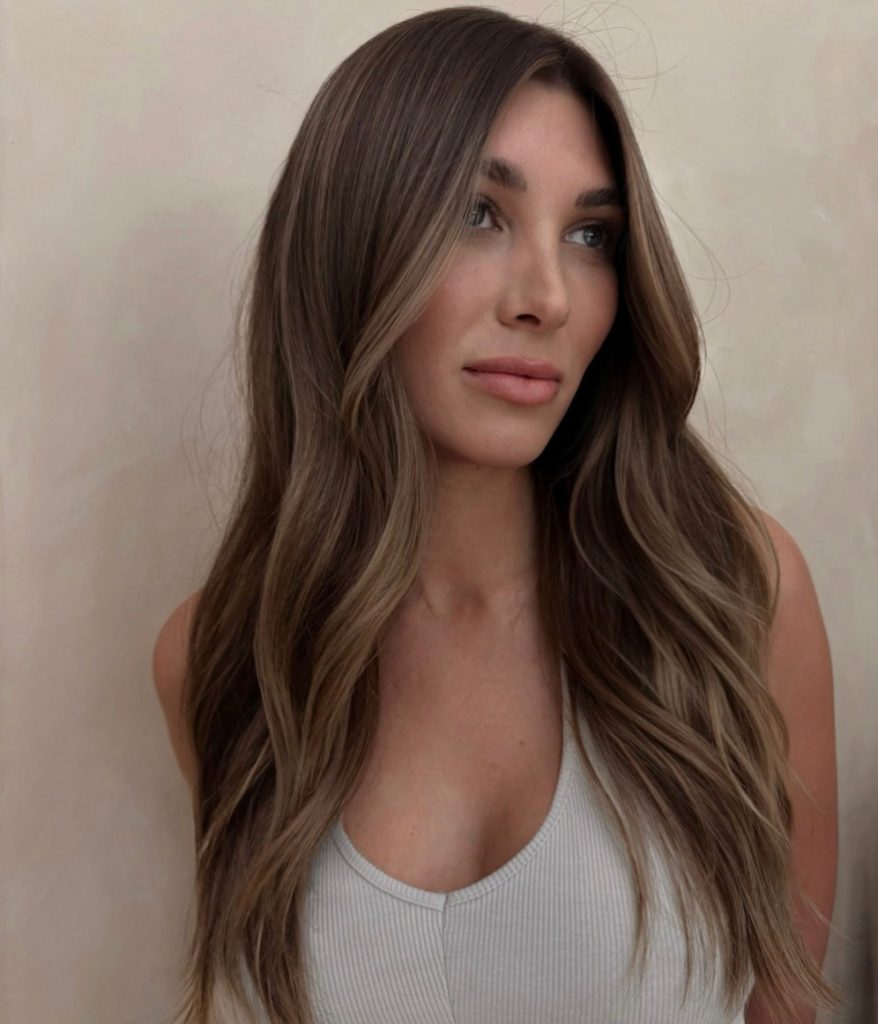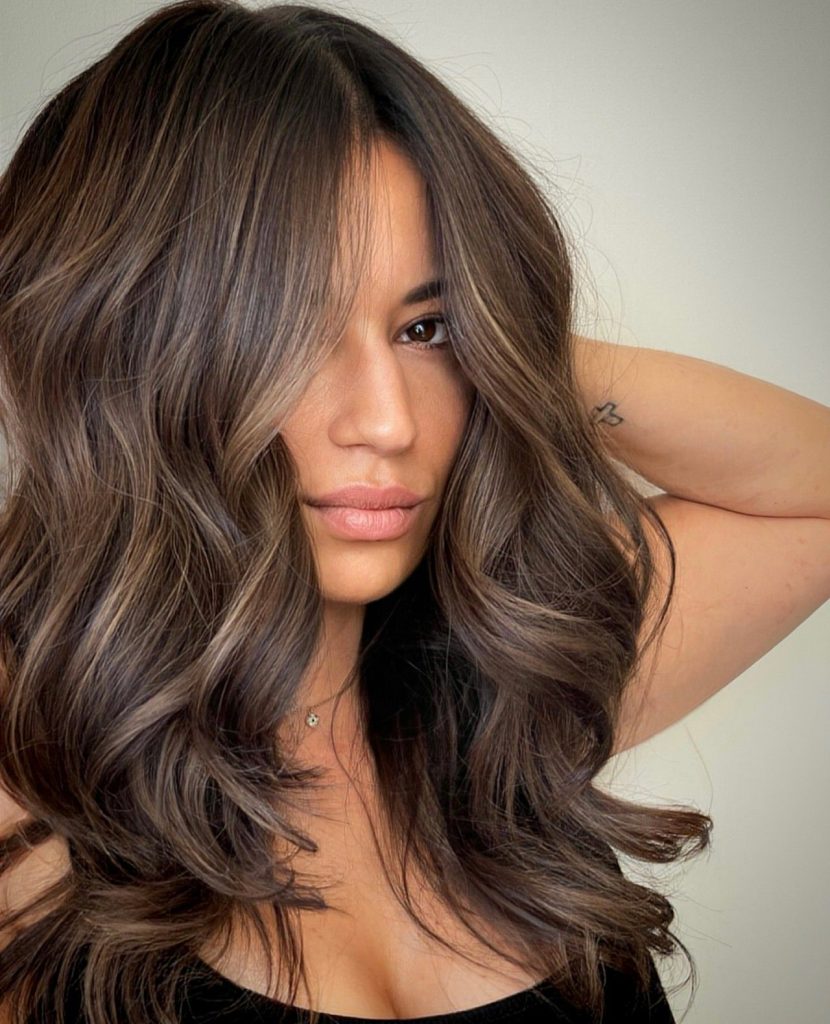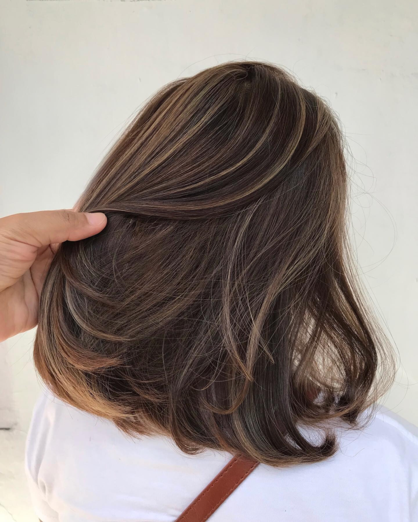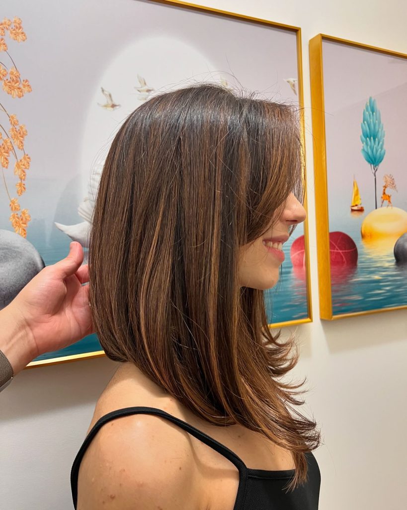 This mid-length version is a beautiful variant that incorporates layers with soft caramel highlights intertwined into the dark base. The highlights are set near the crown and go get creamier at the ends, thus, the hair looks like it was sun-kissed. The layered cut of the hair adds body and the caramel highlights make the hair of color brown feel warmer and more natural. This hairstyle is for girls who want a not very bold change that adds depth to the image.